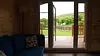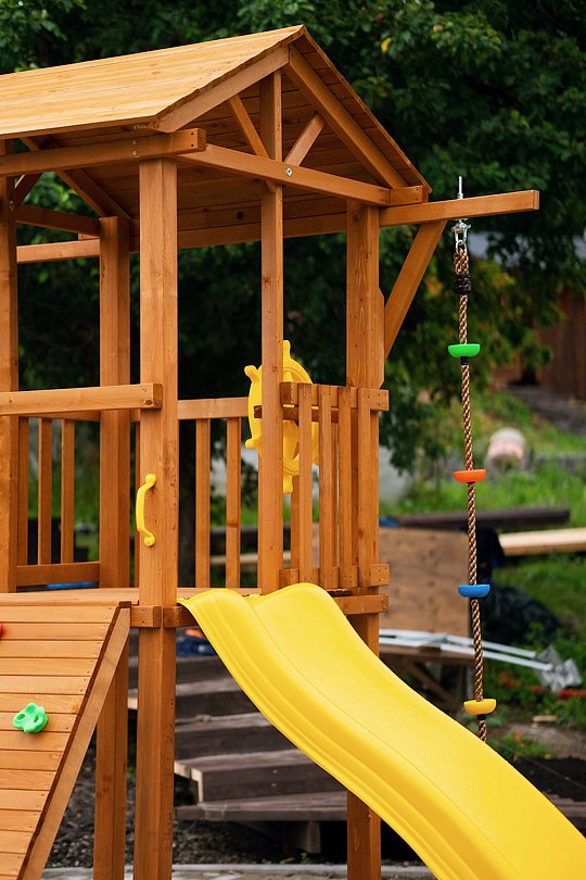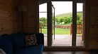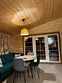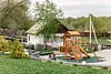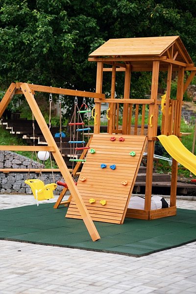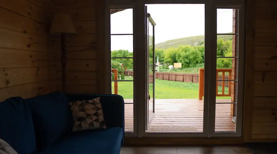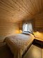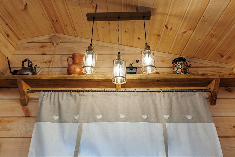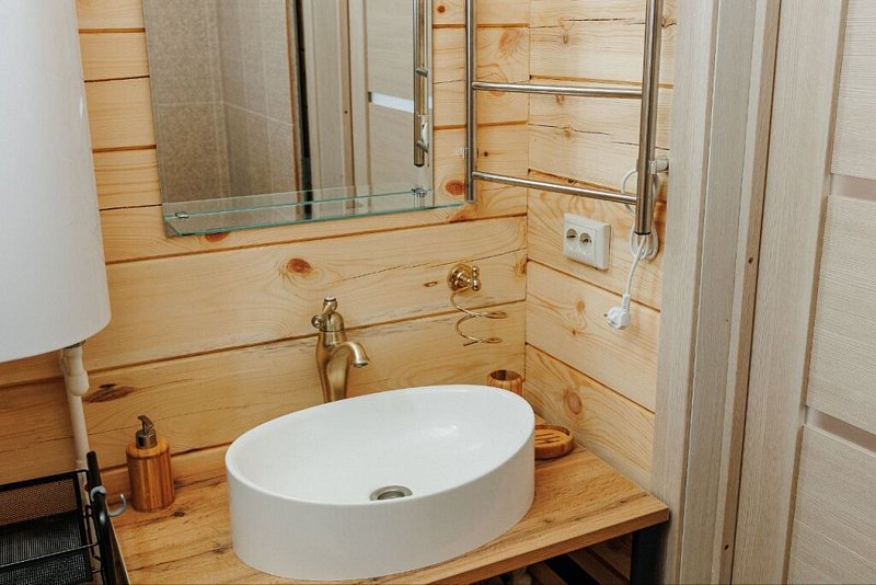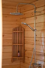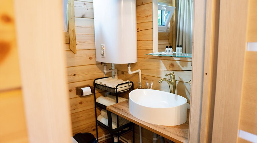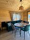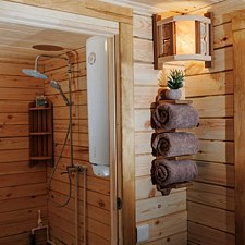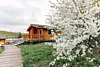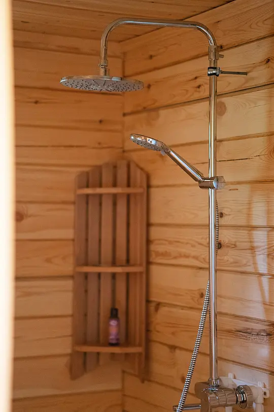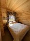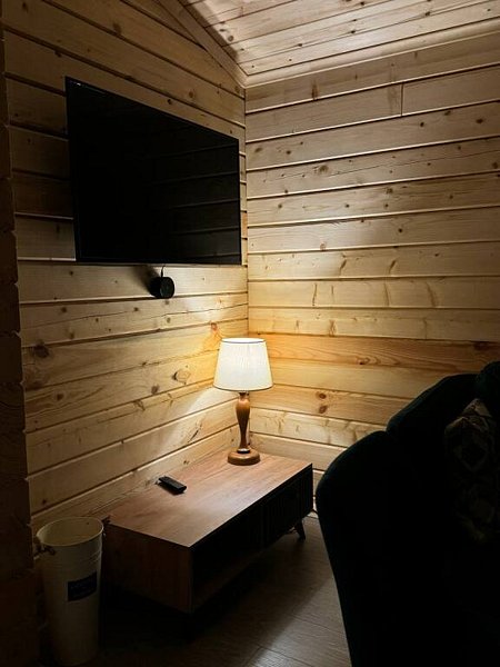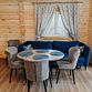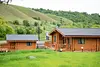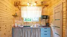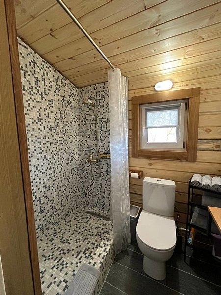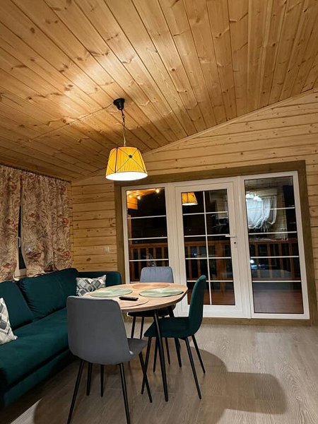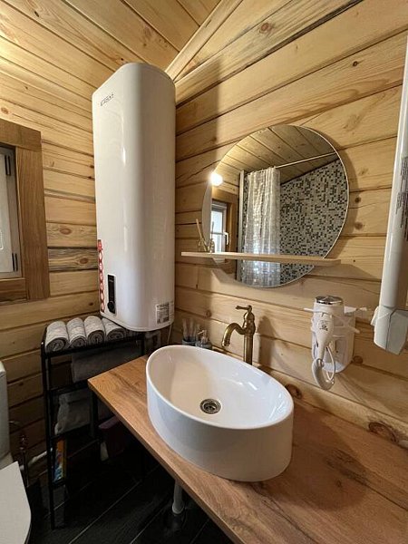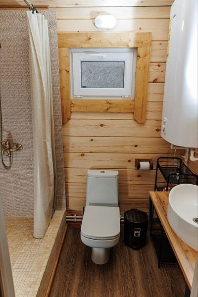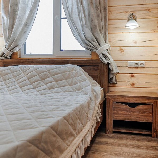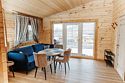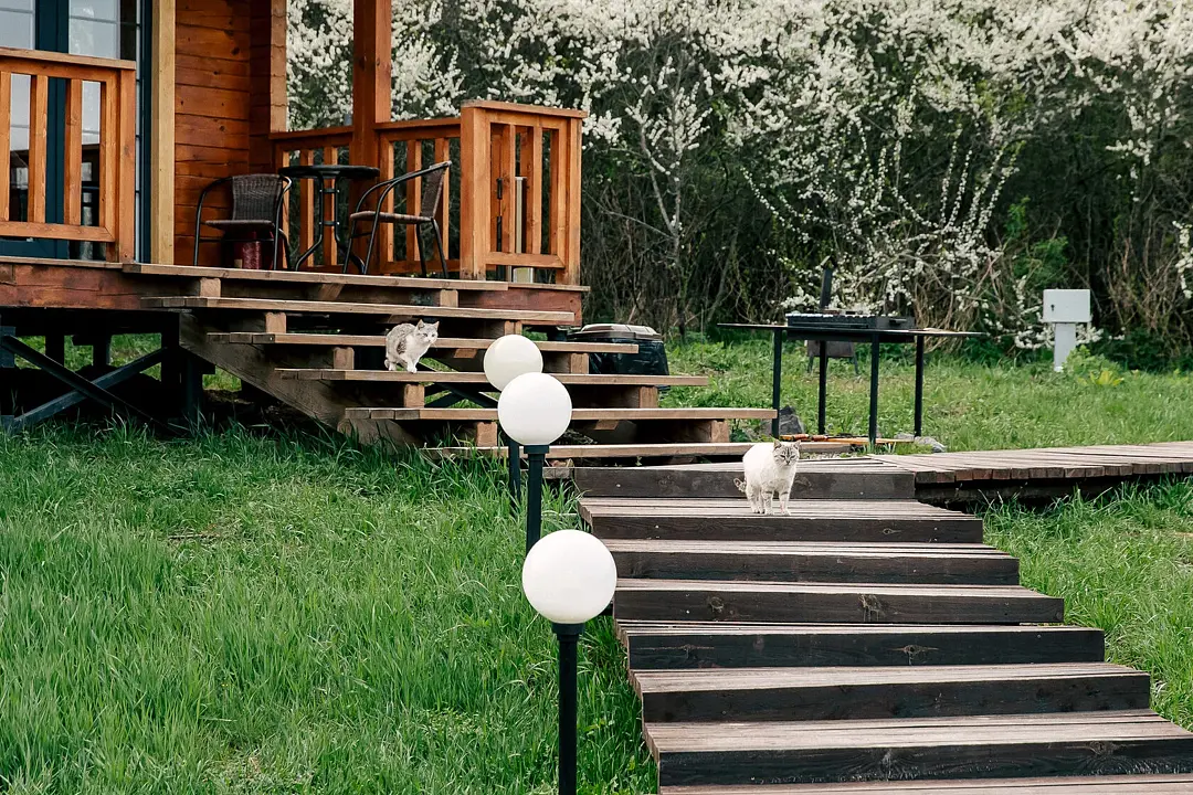 Представлены два больших деревянных домика и один маленький. У каждого есть выход на террасу и личная мангальная зона. Внутри установлена мягкая мебель, двуспальная кровать и есть ванная комната.