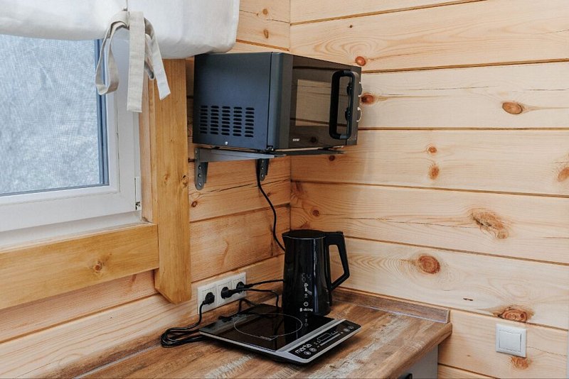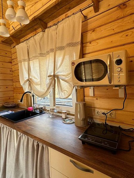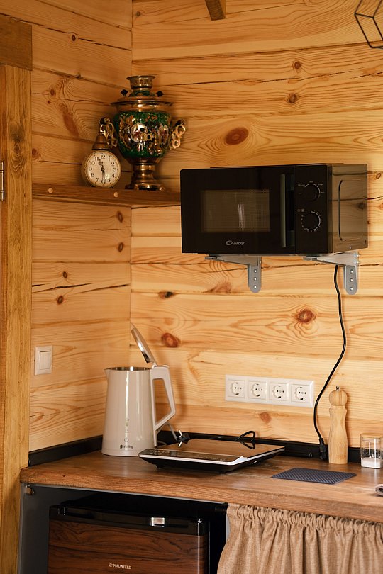 На кухне гости найдут посуду, плиту, холодильник, чайник. На территории работает кофейня.