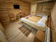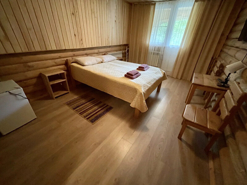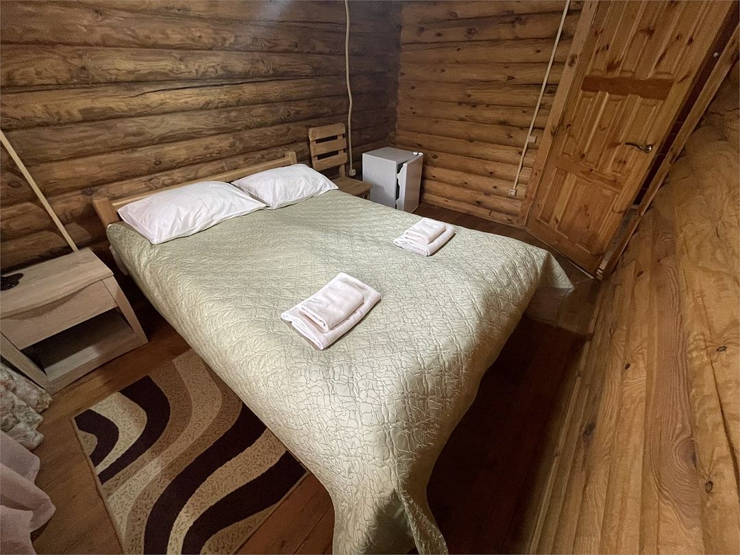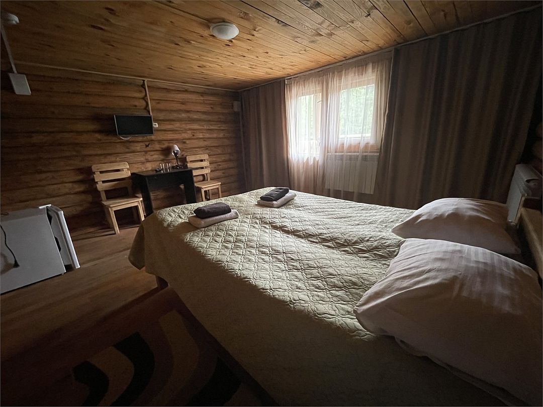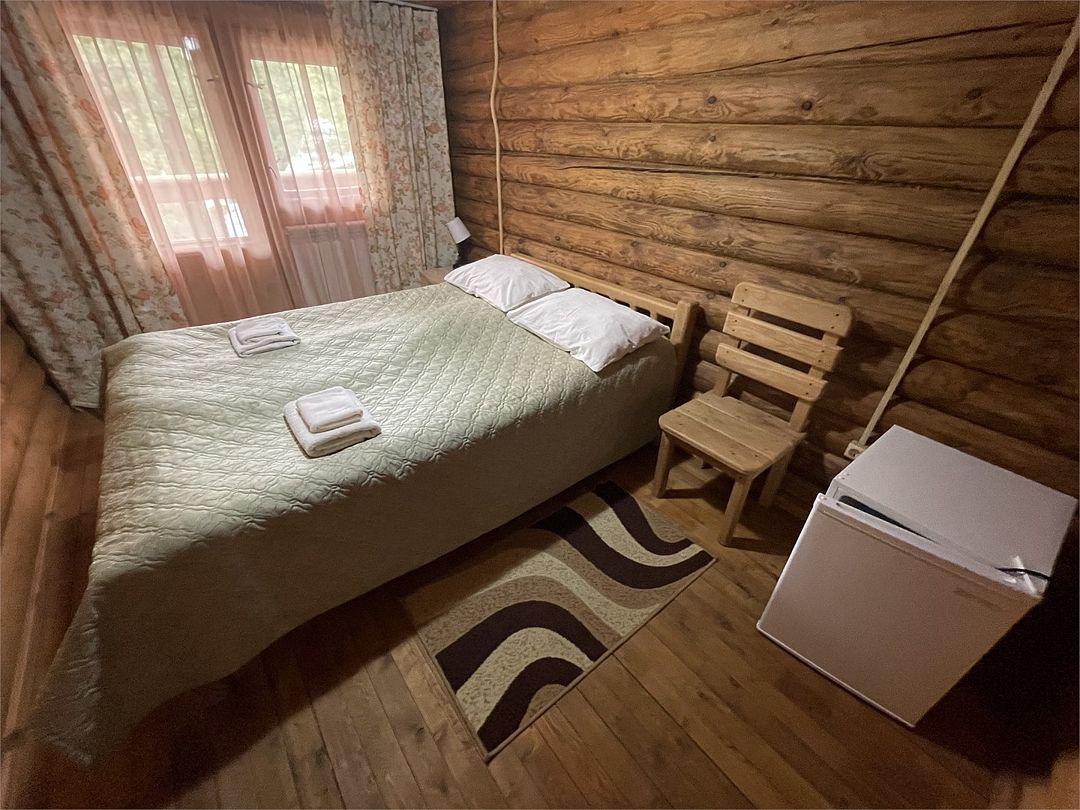 Номер в срубе с двуспальной кроватью, удобствами, телевизором и холодильником.