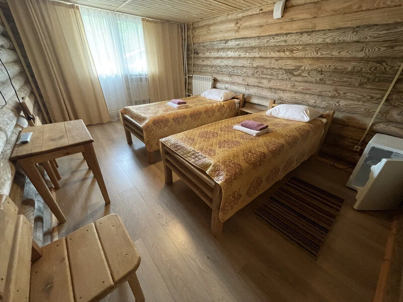Номер в срубе с двумя раздельными кроватями, удобствами, телевизором и холодильником.