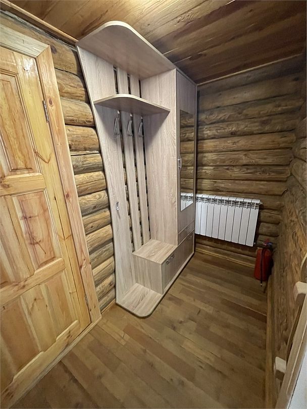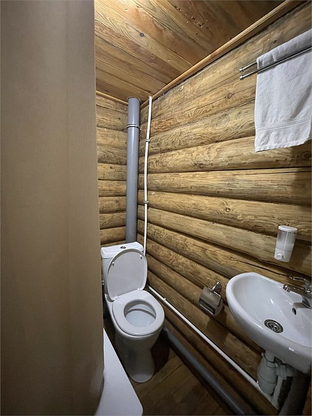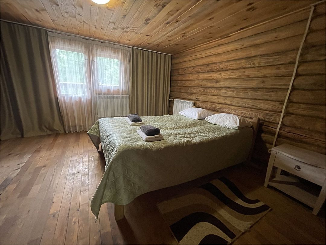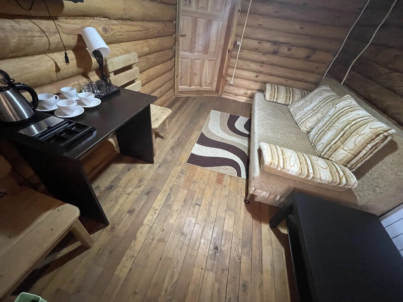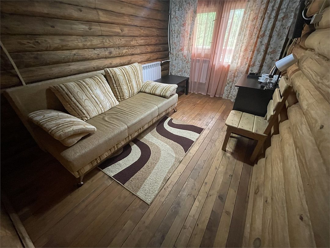 Двухкомнатный номер в срубе с удобствами, телевизором и холодильником. В одной комнате двуспальная кровать, в другой раскладной диван.