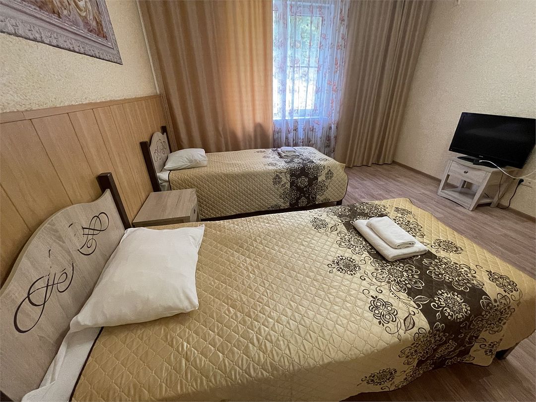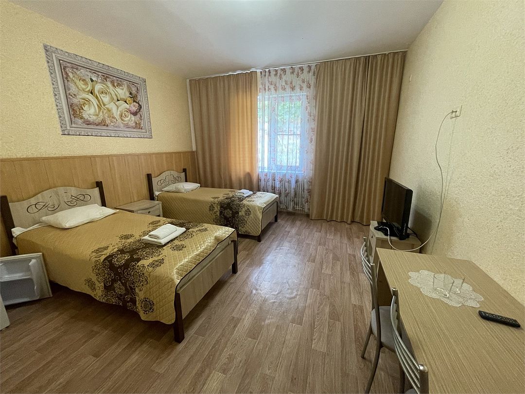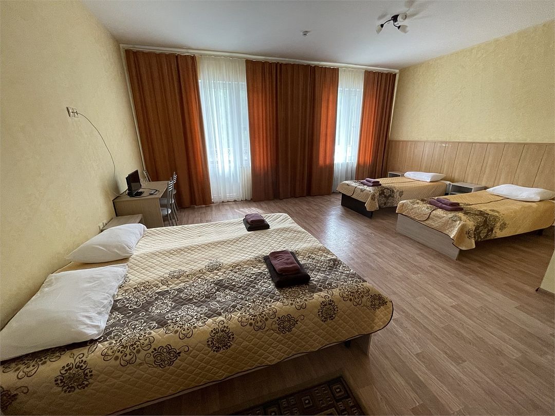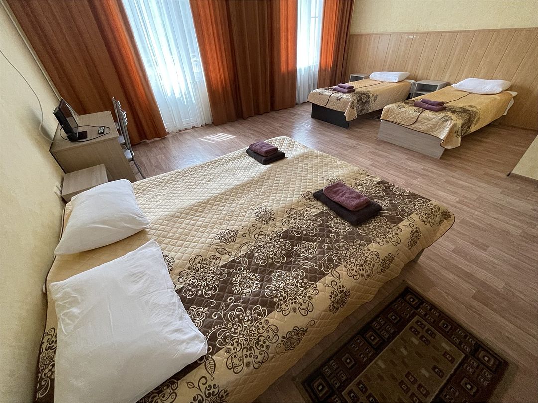 Однокомнатный семейный номер со всеми удобствами. Двуспальная и две раздельные кровати. Без балкона.