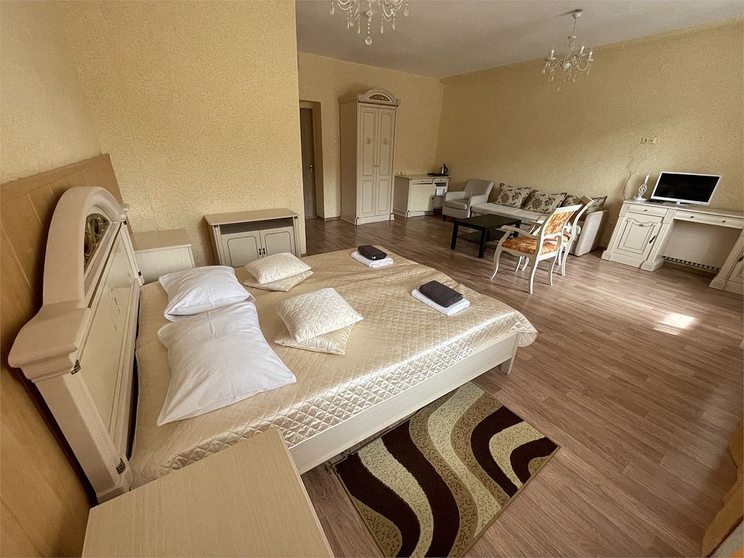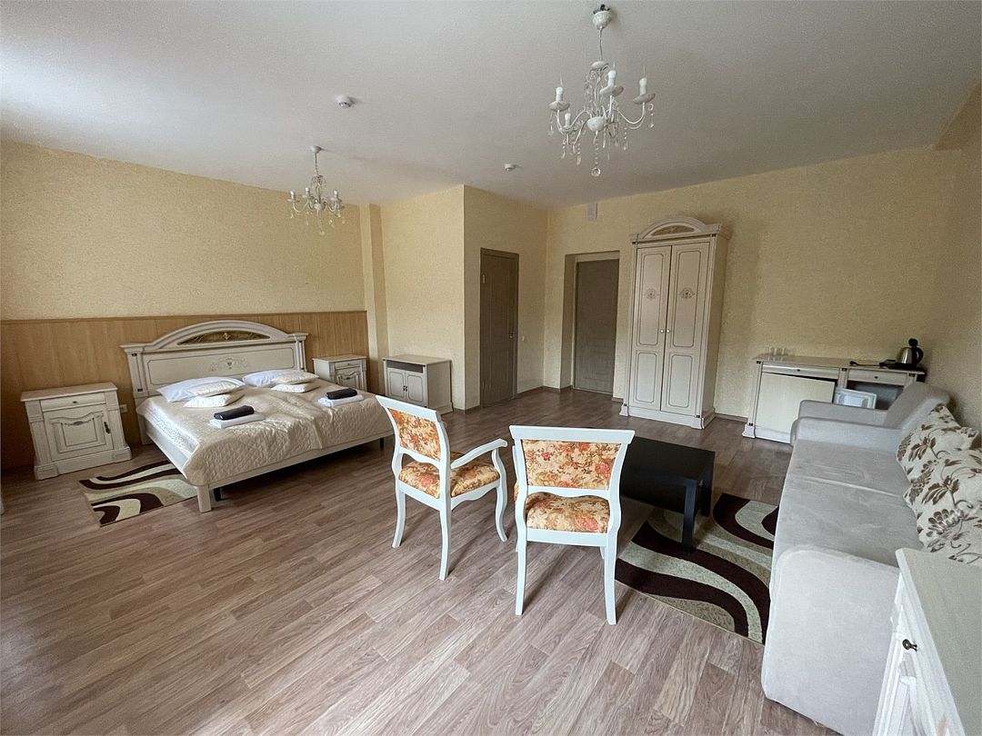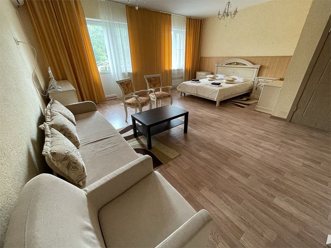 Номер повышенной комфортности со спальной и гостиной зоной. Двуспальная кровать и диван. Есть балкон