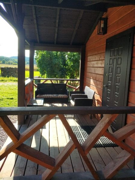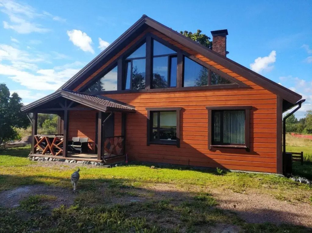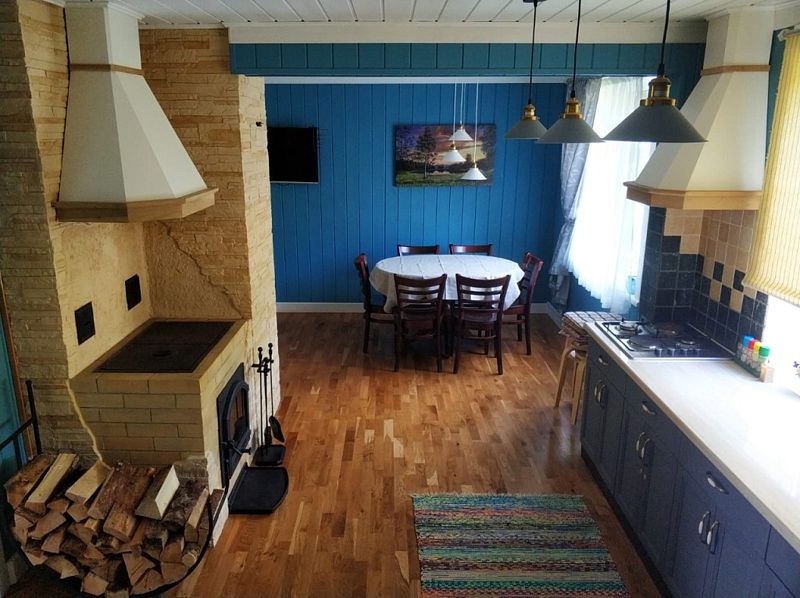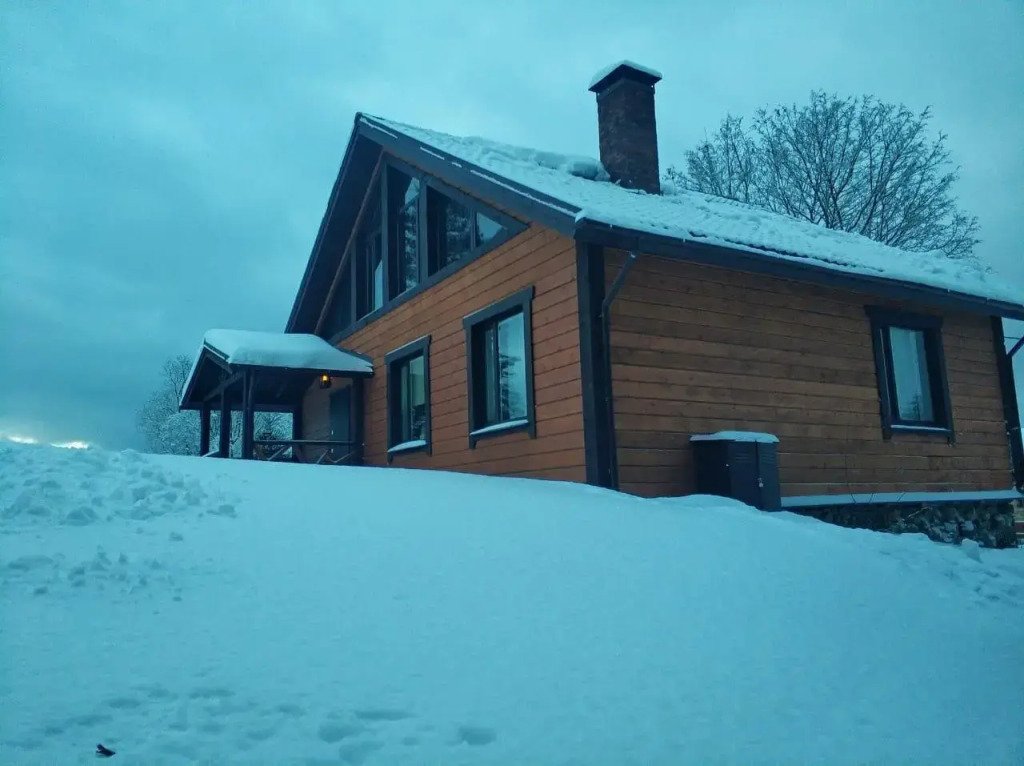 Коттедж рассчитан на размещение до восьми гостей и располагает двуспальными и односпальными кроватями, а также раскладным диваном. Дом полностью оборудован для комфортного проживания: в нем есть необходимая мебель, посуда, холодильник, плита, телевизор и стиральная машина.