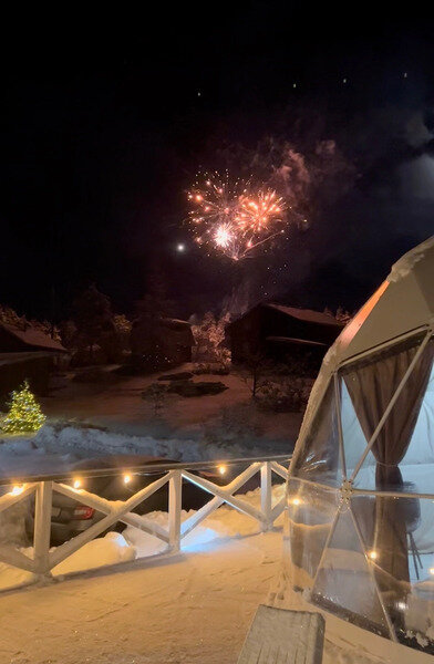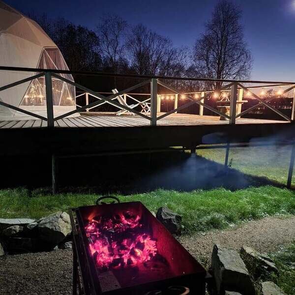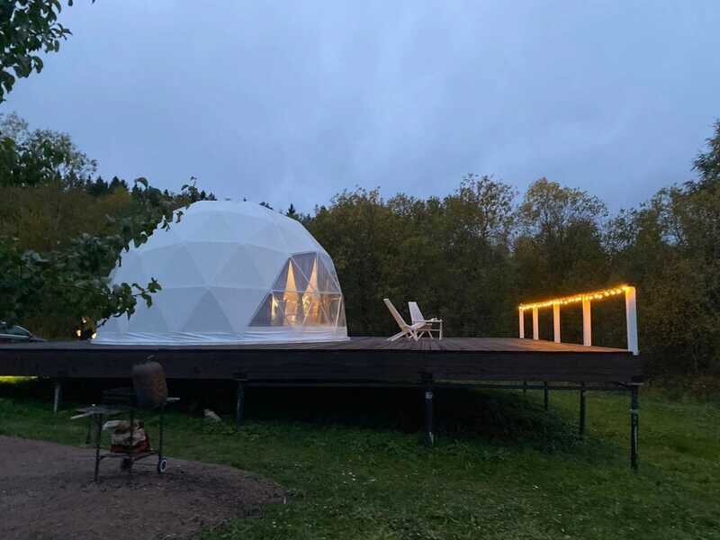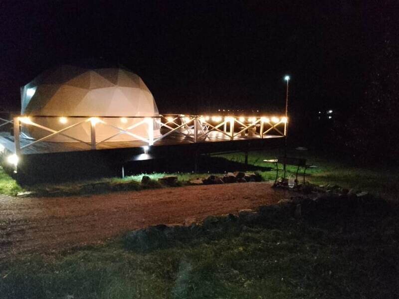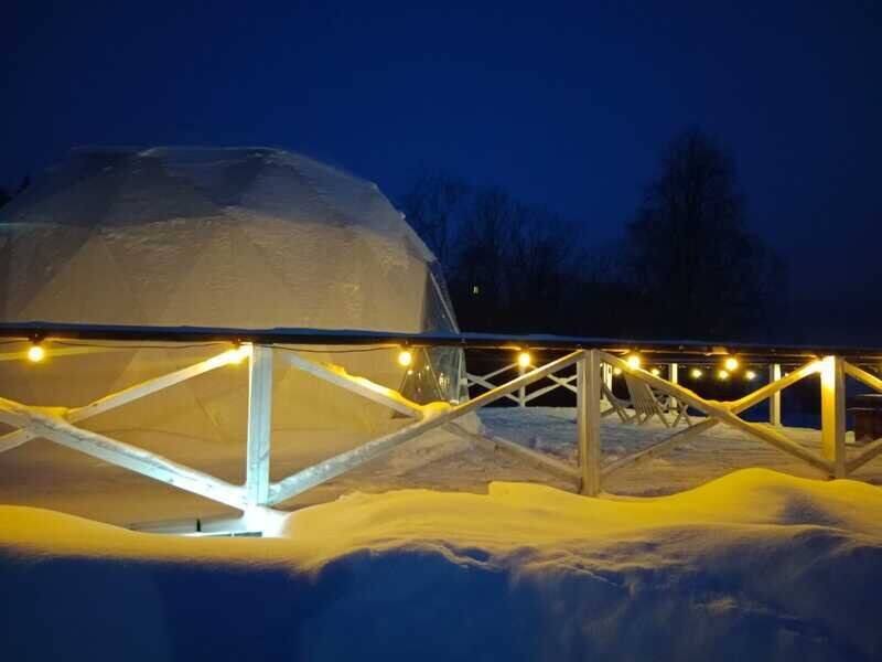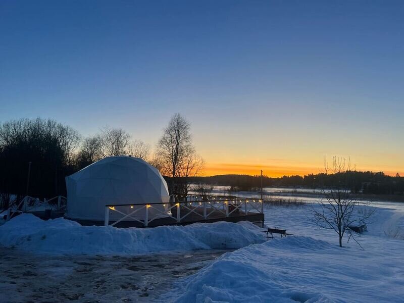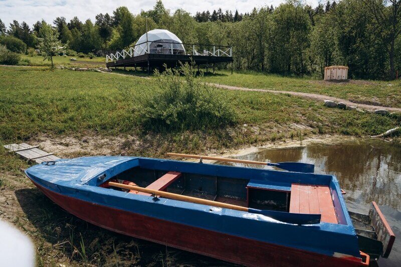 На территории есть терраса уютными столиками и стульями, зона для барбекю с мангалом, а также баня и пирс. Рядом с куполом находится парковка.