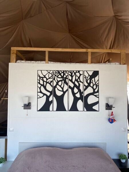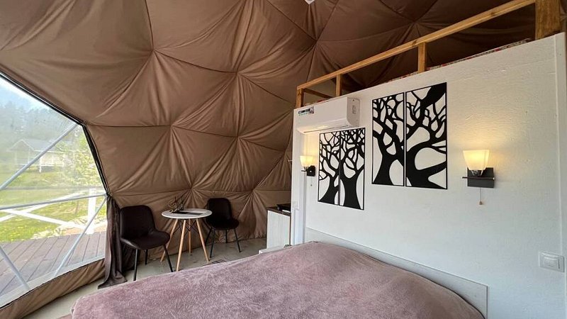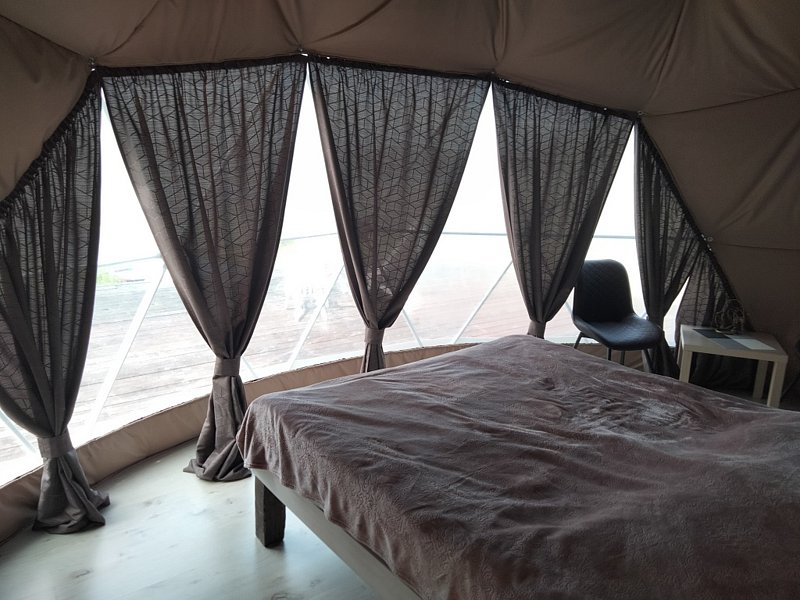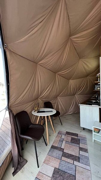 Здесь вы сможете отдохнуть в уютном геокуполе, в котором есть всё необходимое для комфортного проживания: душевая зона, удобная мебель, техника, кондиционер и кухня, на которой есть всё необходимое для приготовления пищи.