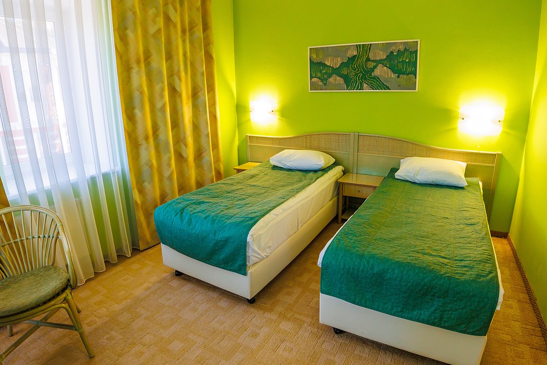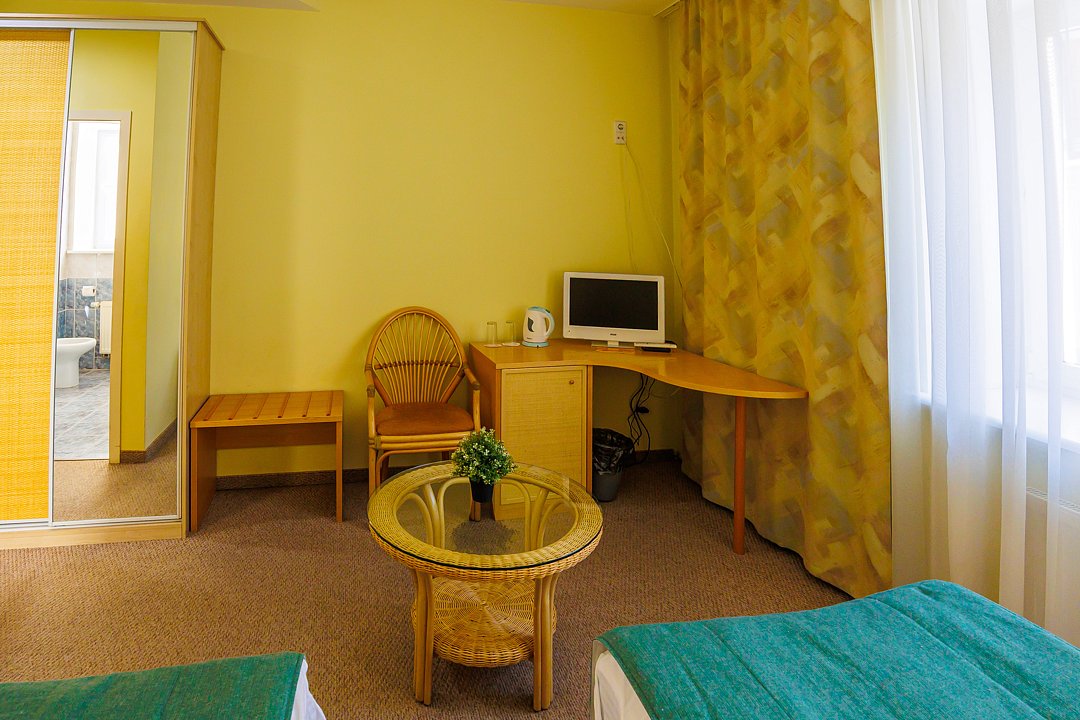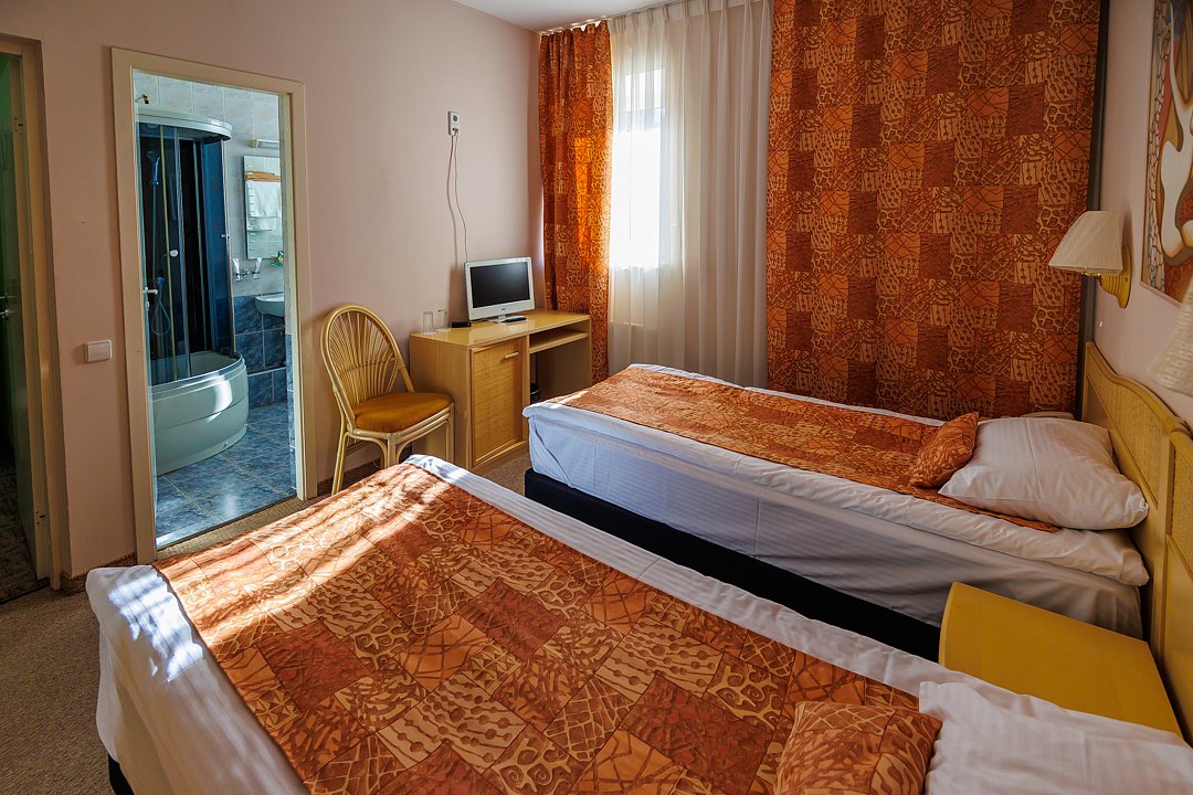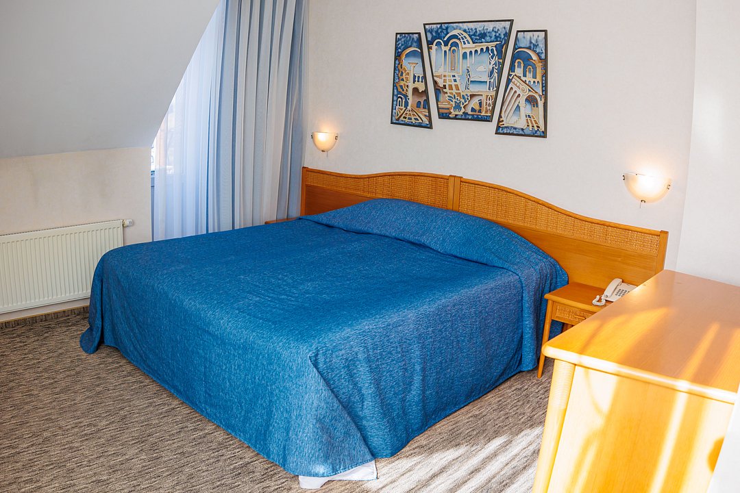Стандартный номер, площадью 18 кв.м., с кондиционером, телефоном, телевизором, минибаром, с большой кроватью, которая может трансформироваться в две раздельные (с прикроватными тумбочками), шкаф-купе, письменный стол.