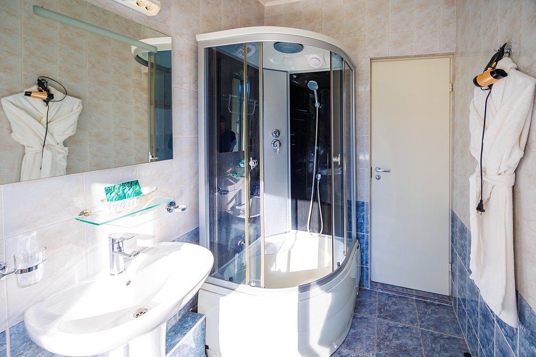В ванной комнате душевая кабина, банные принадлежности, фен, халаты, полотенца, тапочки.