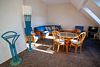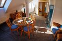В гостиной зоне угловой диван со столиком и большой обеденный стол.