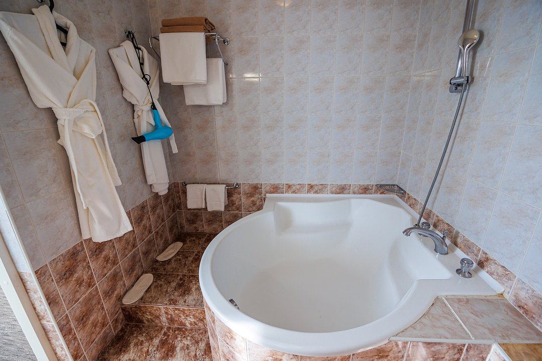 В ванной комнате угловая ванна, ванные принадлежности, фен, халаты, полотенца, тапочки.