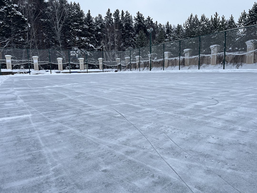 Открытый каток в зимний период с возможностью аренды коньков и инвентаря.
