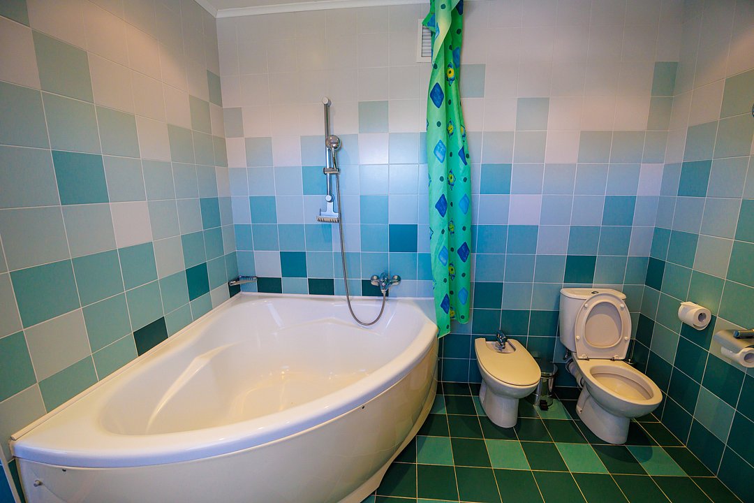 В ванной угловая ванна, биде, банные принадлежности, фен, халаты, полотенца, тапочки.