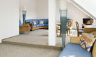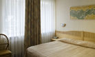Гостевая зона имеет письменный стол, журнальный столик с креслами, шкаф-купе, раскладной диван-канапе. Спальная комната с большой кроватью, которая может трансформироваться в две раздельные (с прикроватными тумбочками), с комодом.
