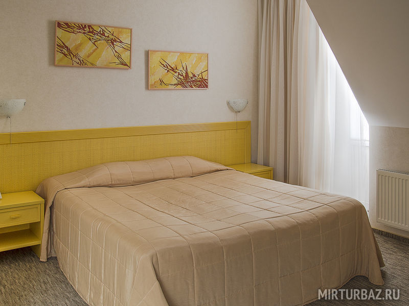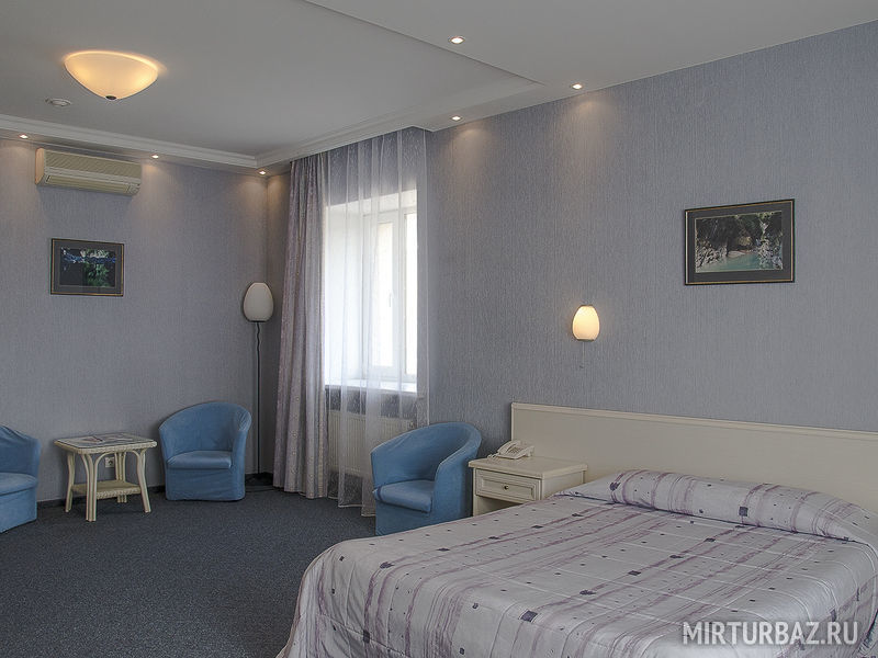 Номер площадью 27 кв. м. c кондиционером, телефоном, телевизором, минибаром, с большой кроватью, которая может трансформироваться в две раздельные (с прикроватными тумбочками), журнальный столик с креслами, шкаф-купе.