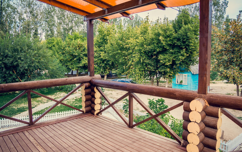 - Крытая уличная веранда с мангалом, столом и стульями.
