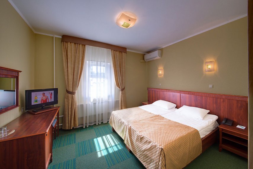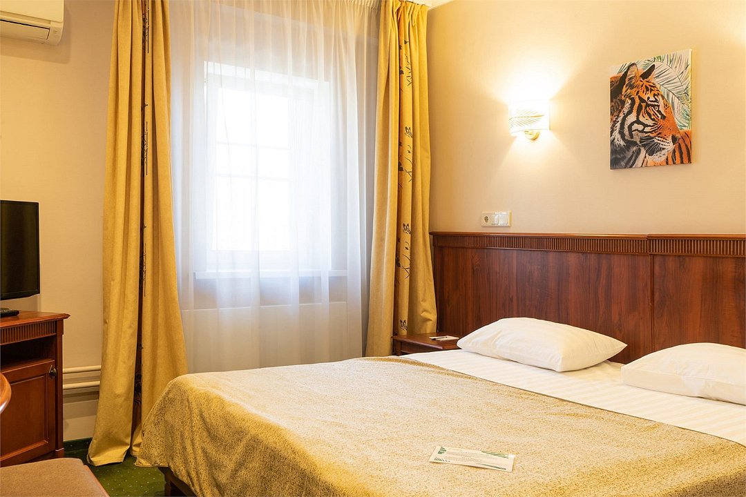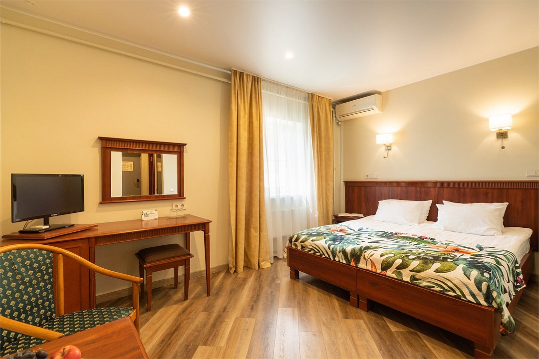 • плазменная ТВ-панель; • телефон; • интернет/Wi-Fi. Ванные комнаты оснащены: • туалетными принадлежностями; • полотенцами; • феном; • тапочками. Бесплатные услуги: • услуга по побудке гостей к определенному времени; • информационная служба, которая поможет клиенту сориентироваться в городе; • вызов скорой помощи; • вызов такси; • доставка в номер корреспонденции при её получении; • предоставление кипятка, иголок, ниток, одного комплекта посуды и столовых приборов; • поднос багажа; • стоянка автомобиля. Дополнительные услуги: • Room Service (круглосуточно); • услуги прачечной; • мелкий ремонт одежды. ВАЖНО: Размещение детей в данной категории номера возможно только на одной кровати с родителями, дополнительное место не предоставляется.Услуги и удобства