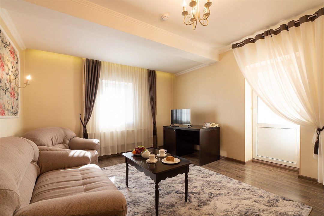 • плазменная ТВ-панель; • кондиционер; • мини-холодильник; • чайный набор; • телефон; • интернет/Wi-Fi. Ванные комнаты оснащены: • туалетными принадлежностями; • полотенцами; • феном; • тапочками; • халатом. Бесплатные услуги: • услуга по побудке гостей к определенному времени; • информационная служба, которая поможет клиенту сориентироваться в городе; • вызов скорой помощи; • вызов такси; • доставка в номер корреспонденции при её получении; • предоставление кипятка, иголок, ниток, одного комплекта посуды и столовых приборов; • поднос багажа; • стоянка автомобиля; • детская кроватка (до 3-х лет) Дополнительные услуги: • Room Service (круглосуточно); • услуги прачечной; • мелкий ремонт одежды.Услуги и удобства