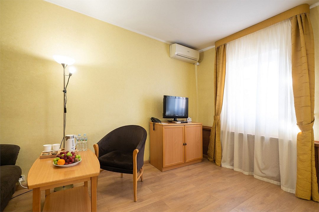 - .Комната переговоров (люкс «Сьют»). Вместимость: 6 человек. Оборудование: кондиционер. Стоимость — от 8000 ₽/сутки.