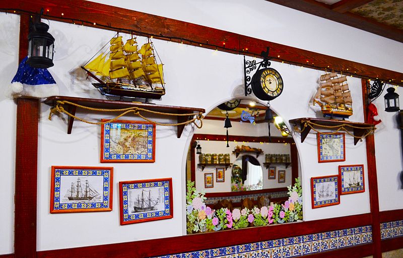 Горячие завтраки входят в стоимость бронирования. На территории базы отдыха есть кафе, где подаются блюда русской и европейской кухни. Кафе выполнено в аскетичных тонах морской тематики. В тёплое время года гости могут расположиться за летними столиками у озера и наблюдать за фонтанами.
