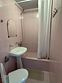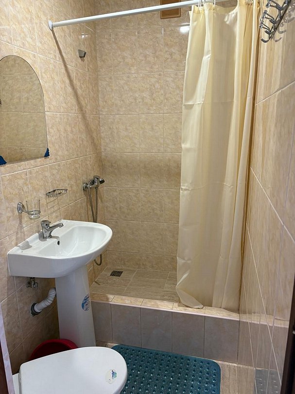 Санузел в номере: Душ, раковина, унитаз, зеркало.