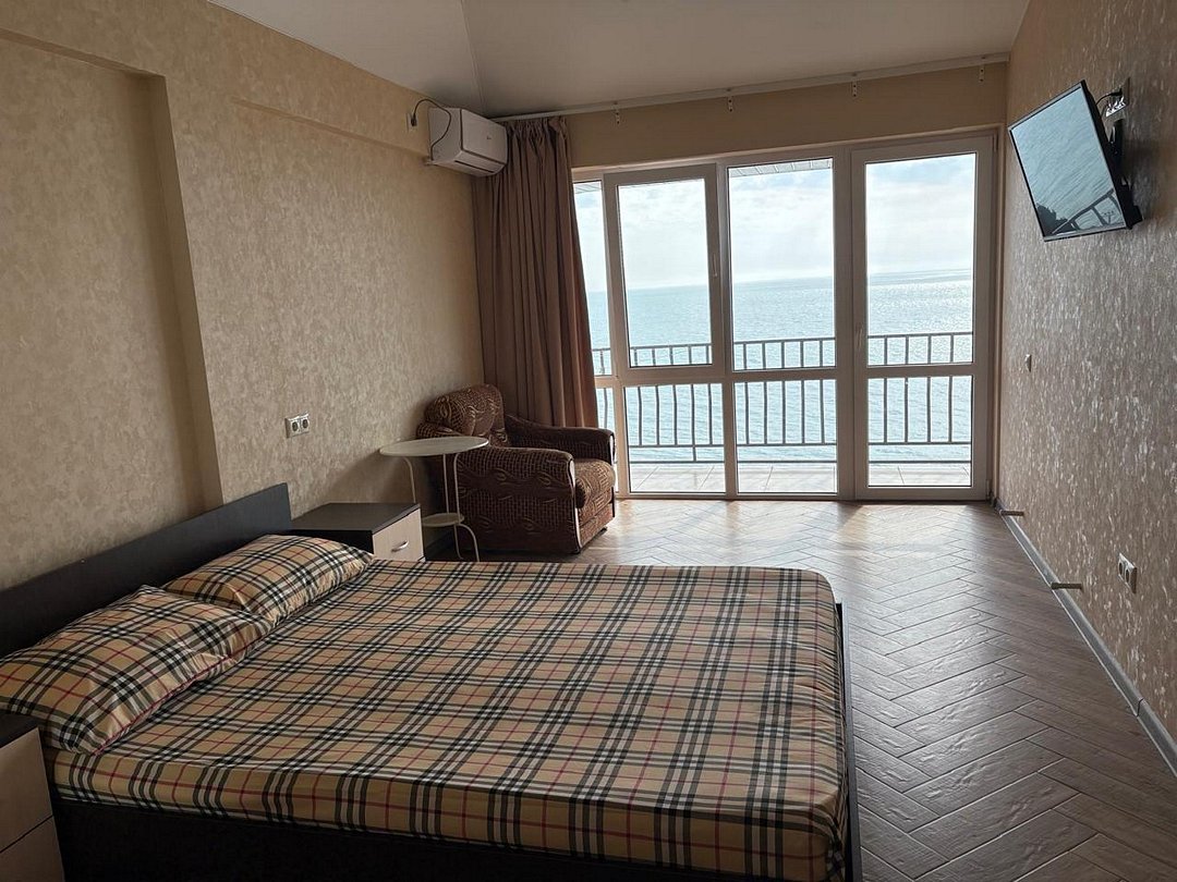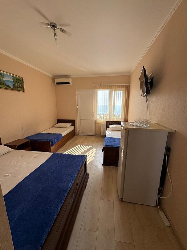 В номере имеется 2 отдельные комнаты, Одна комната с видом на море с панорамными окнами оснащена удобной двуспальной кроватью, прикроватными тумбочками ,журнальным столиком, сплит системой, холодильником, жк телевизором, бельевым шкафом, кресло раскладное (доп. место). Вторая комната с окнами во двор оснащена 2 отдельными кроватями, прикроватными тумбочками, ЖК телевизором. Wi -Fi бесплатно на всей территории.