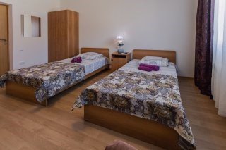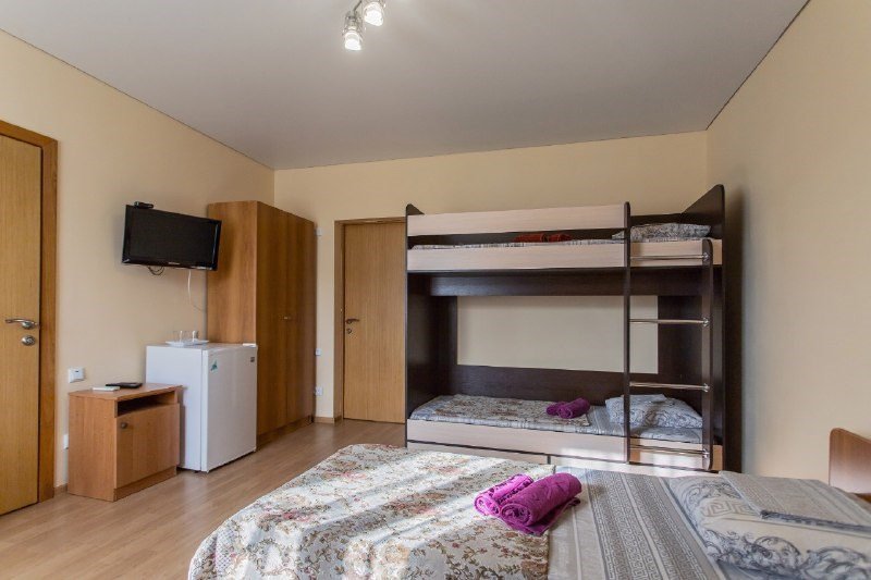 Шестиместный семейный номер, от 1 до 8 человек. В номере размещены 6 односпальных кроватей, холодильник, чайник, телевизор, журнальный столик, 2 стула, ванная комната с душем, шкаф. В ванной комнате— душ, туалет, полотенца, фен, средства гигиены, комплект полотенец.Услуги и удобства