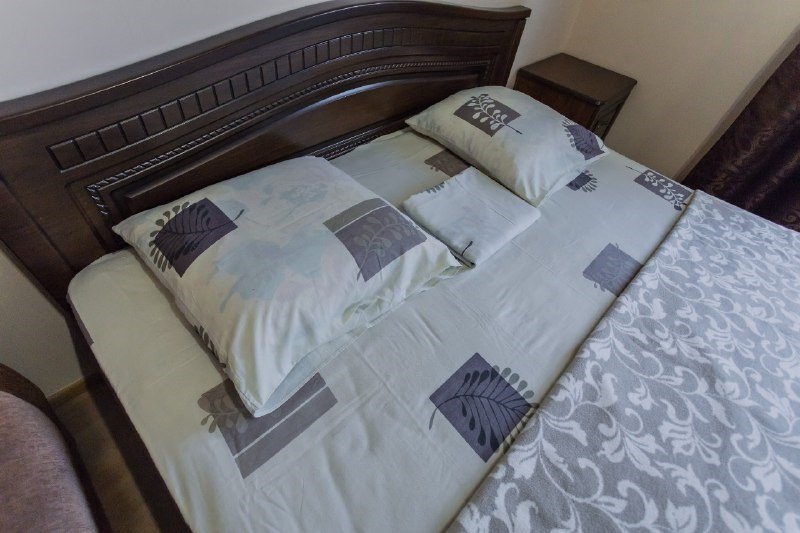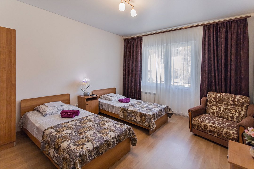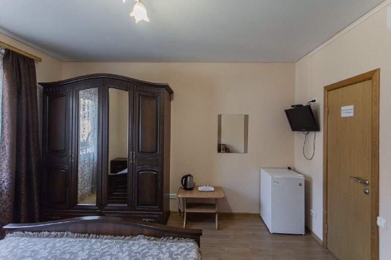 Двухкомнатный семейный номер, от 1 до 5 человек, с большой двуспальной кроватью и раскладным диваном. В номере холодильник, чайник, телевизор, телевизор, шкаф, кухонный гарнитур, стулья, ванная комната с душевой кабиной. В ванной — душевая кабина, унитаз, фен, средства гигиены, комплект полотенецУслуги и удобства