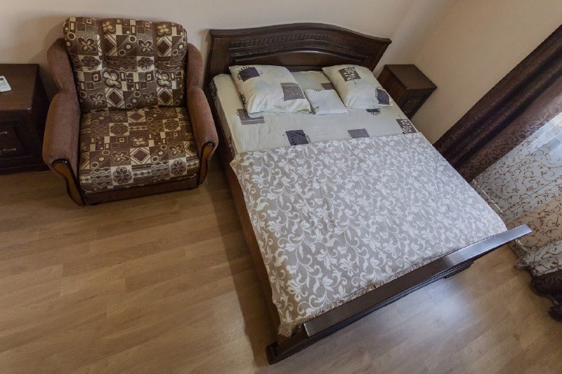 Двухместный семейный номер, от 1 до 3 человек, с большой двуспальной кроватью + доп местом раскладным комфортным креслом, с балконом, видом на реку, горы и сад. В номере холодильник, чайник, телевизор, ванная комната с душем, журнальный столик, 2 стула, холодильник, телевизор, шкаф. В ванной — фен, средства гигиены, комплект полотенец.Услуги и удобства