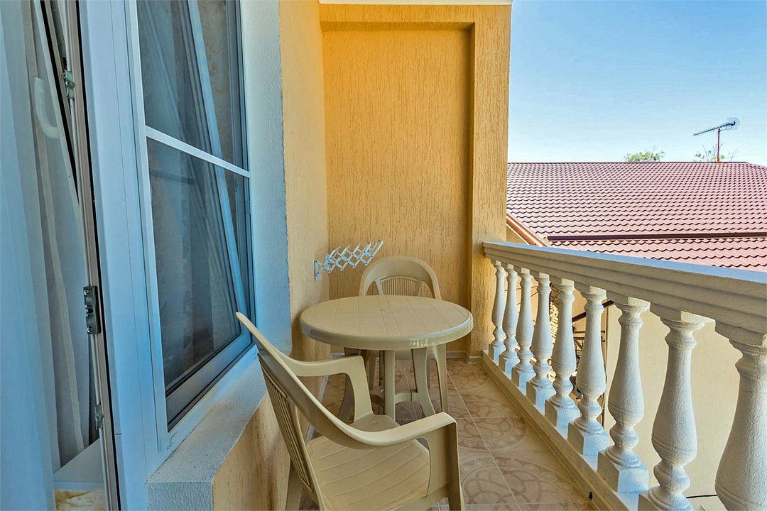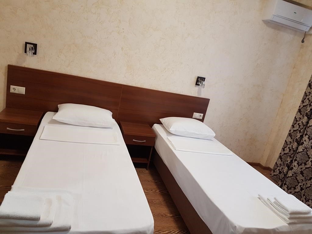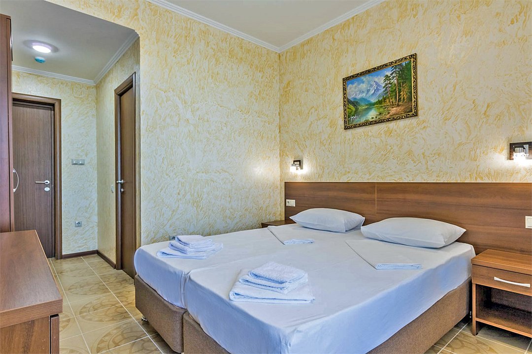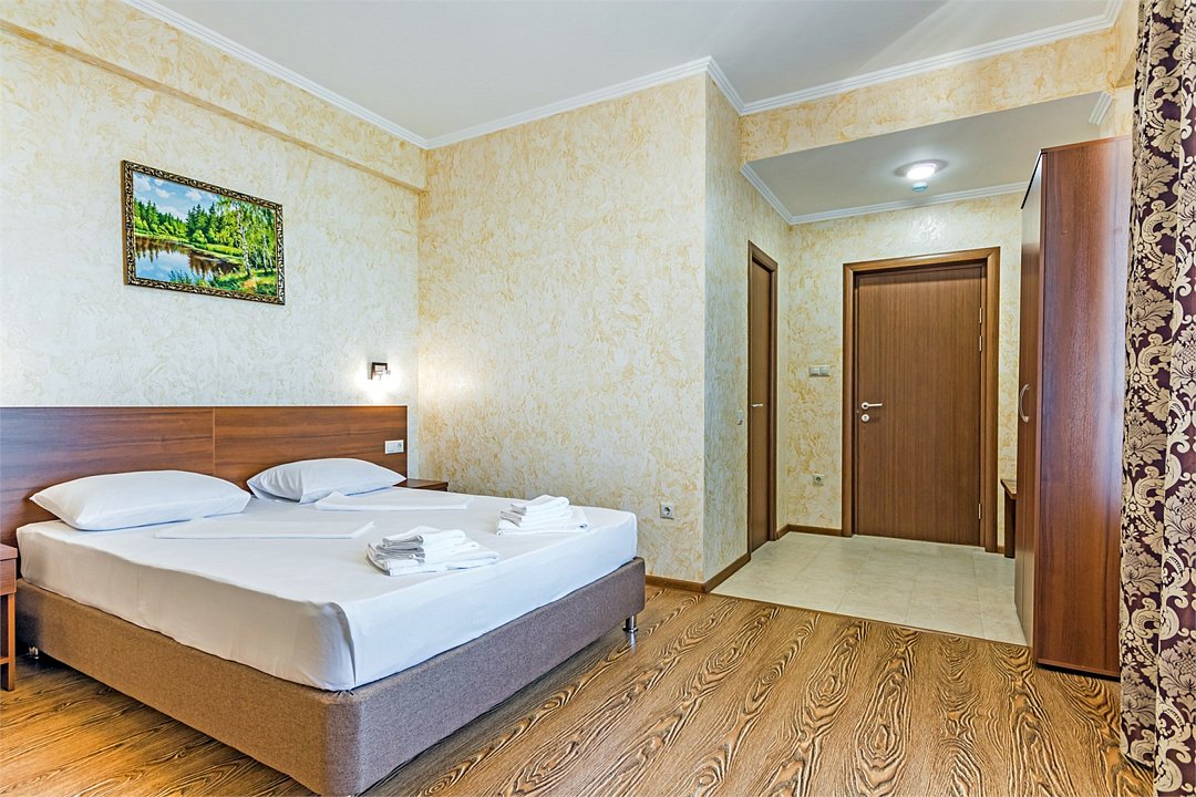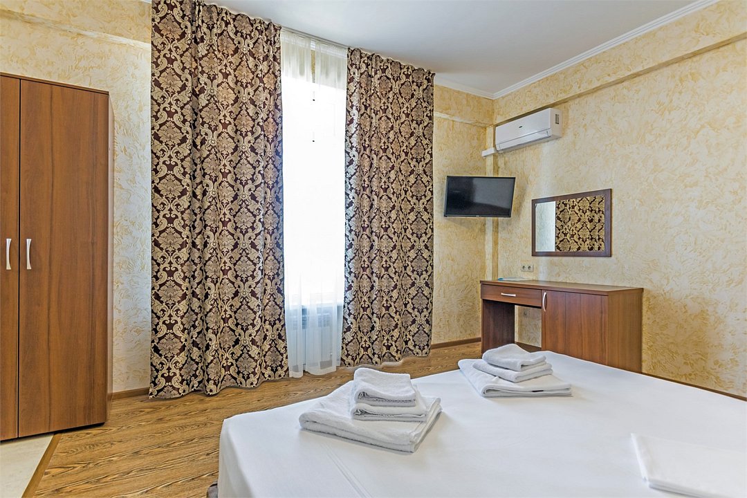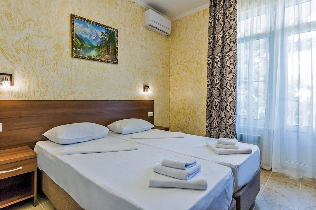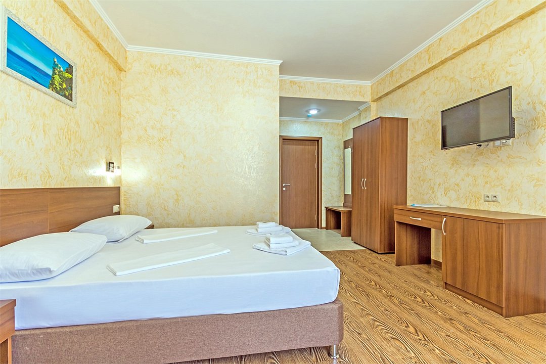 телевизор, спутниковое телевидение, Wi-Fi, кондиционер, светильник, фен, санузел, балкон, две односпальные или большая двуспальная кровать, тумбы, стулья, шкаф для одежды, вешалки, письменный стол, зеркало, раковина, душ, вид на море, кулер на этаже, туалетные средства, мангал, сушилка для белья, раскладной диван, мини-холодильник, москитная сетка, услуги прачечной (платно), мини-бар (платно), затемняющая штораВ номере