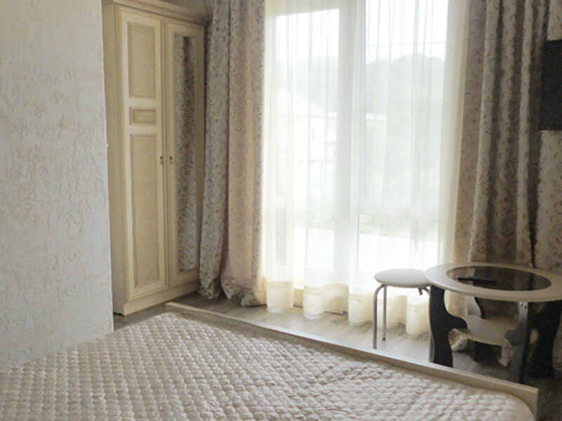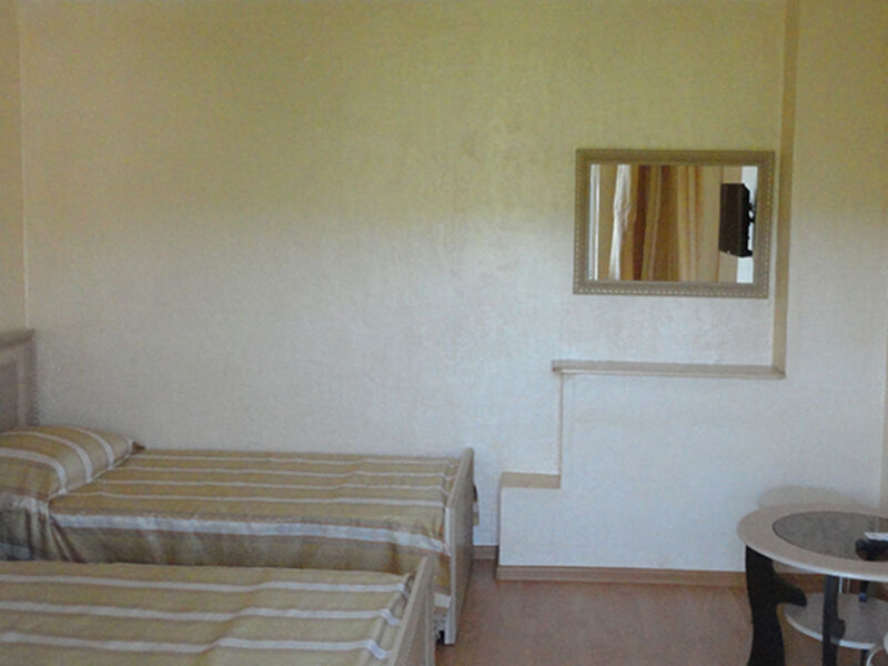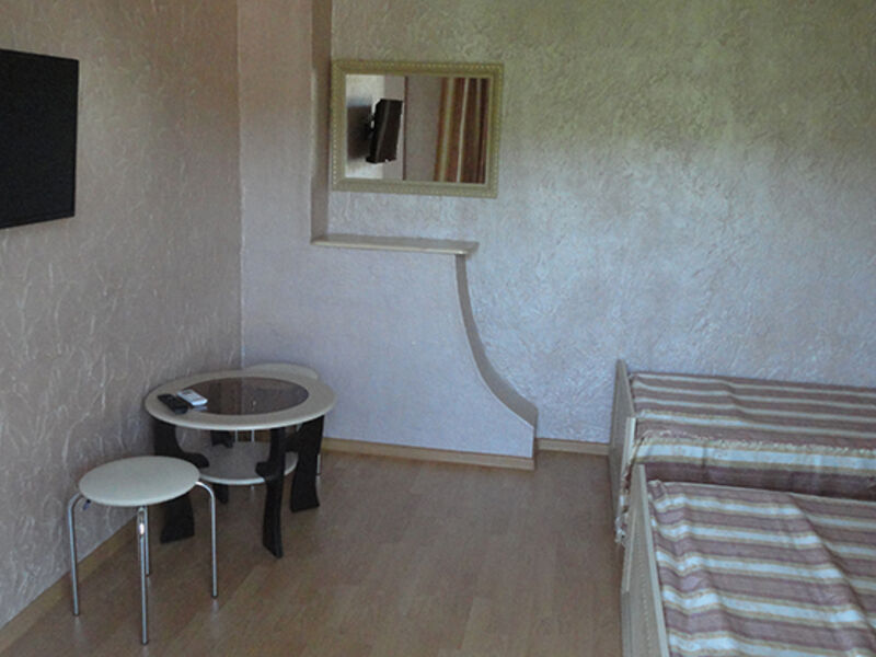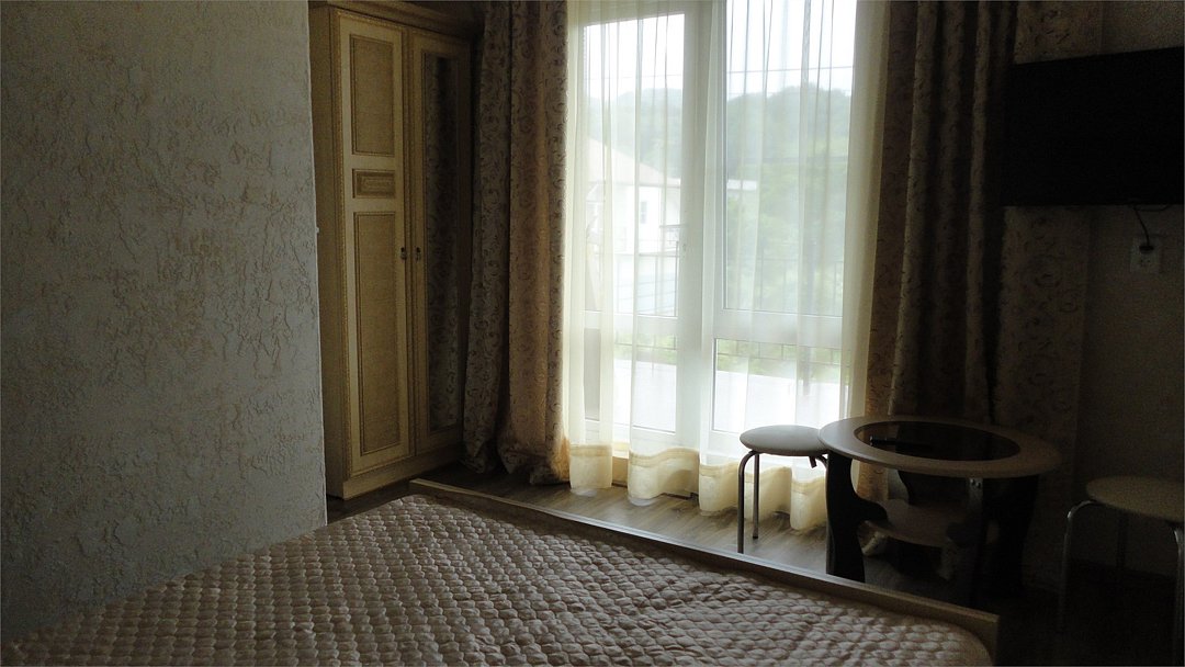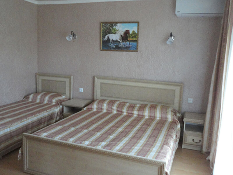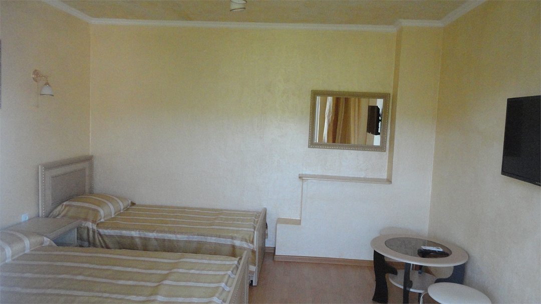 Трехэтажный корпус гостевого дома занимает территорию площадью 4000 кв.м. с внутренним двориком. Отдыхающим отель предлагает номера Стандарт, Повышенной комфортности и Люксы, оснащенные кухней. В каждом номере имеется собственный санузел и стандартный набор техники — телевизор, холодильник и сплит-система.