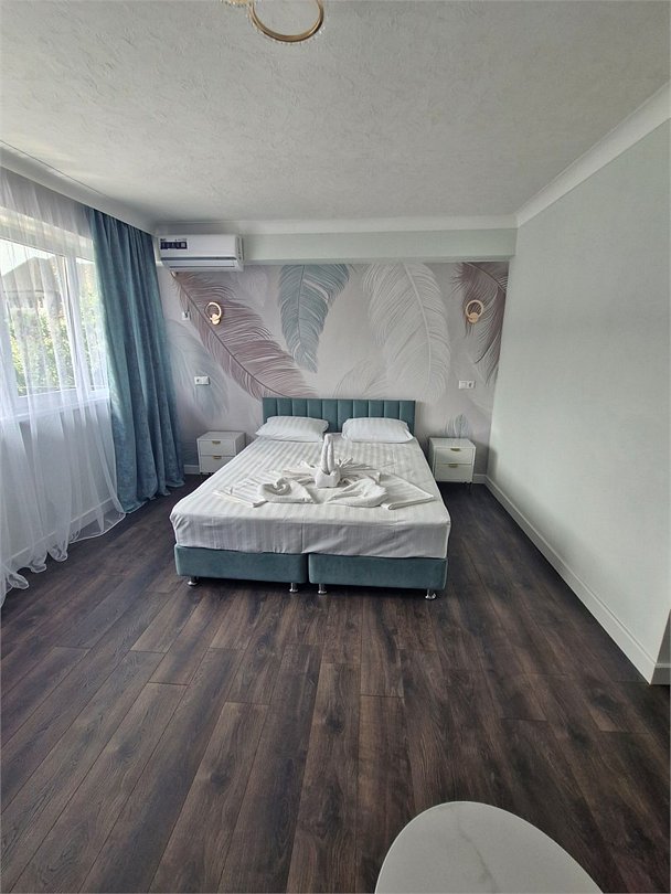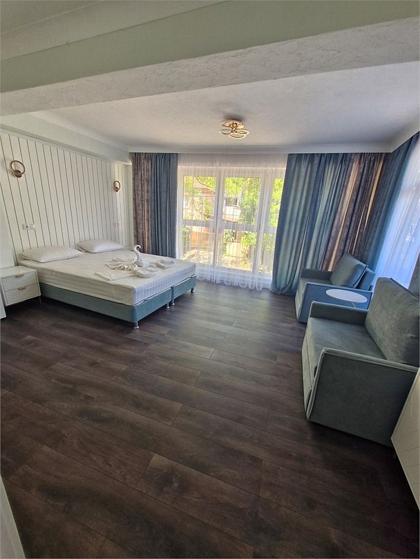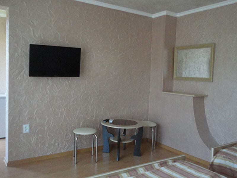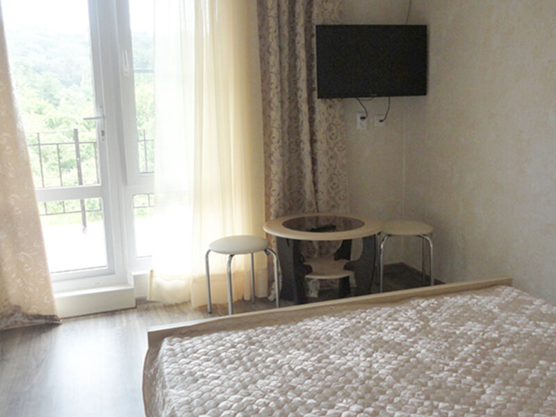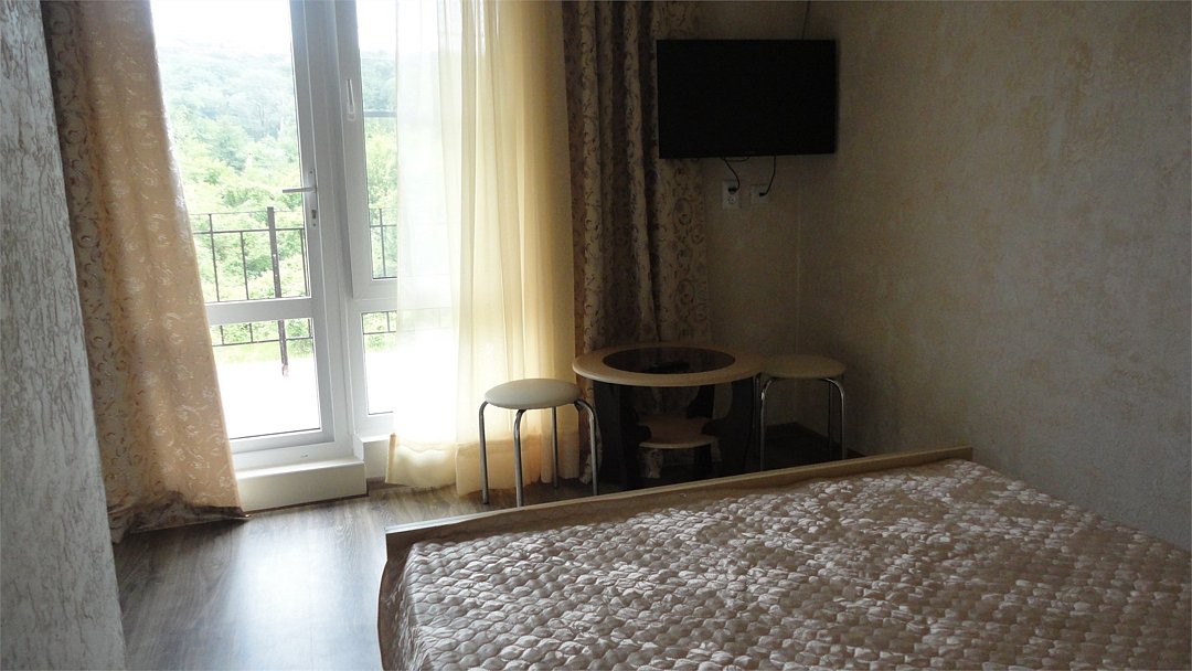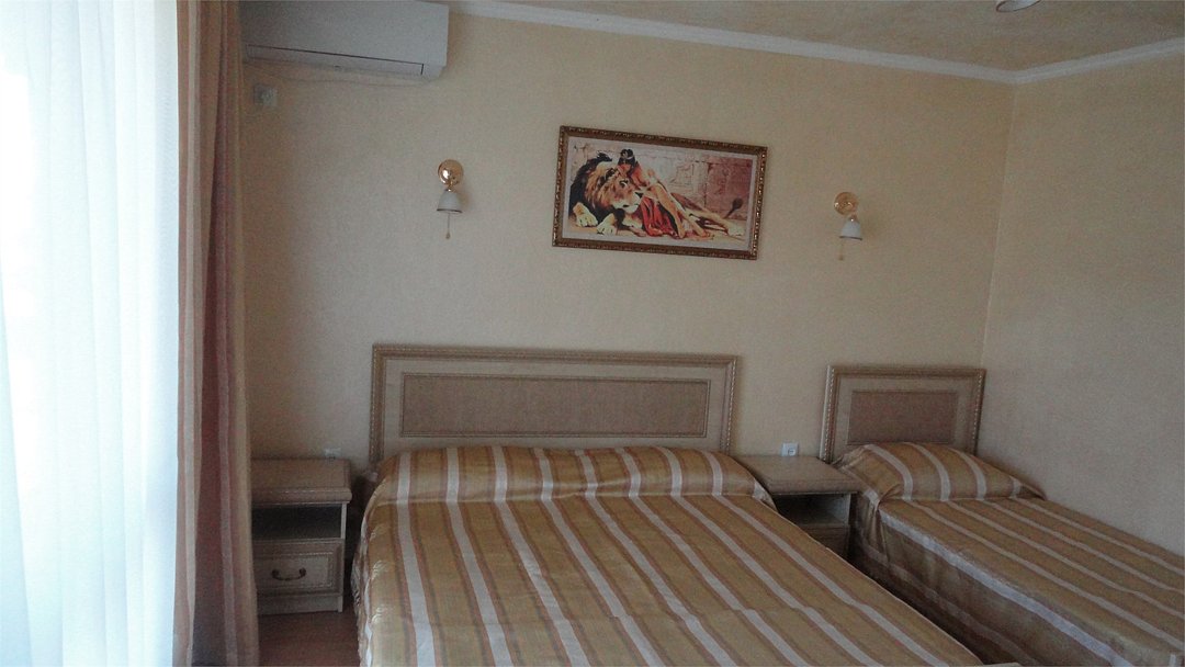 Трехэтажный корпус гостевого дома занимает территорию площадью 4000 кв.м. с внутренним двориком. Отдыхающим отель предлагает номера Стандарт, Повышенной комфортности и Люксы, оснащенные кухней. В каждом номере имеется собственный санузел и стандартный набор техники — телевизор, холодильник и сплит-система.