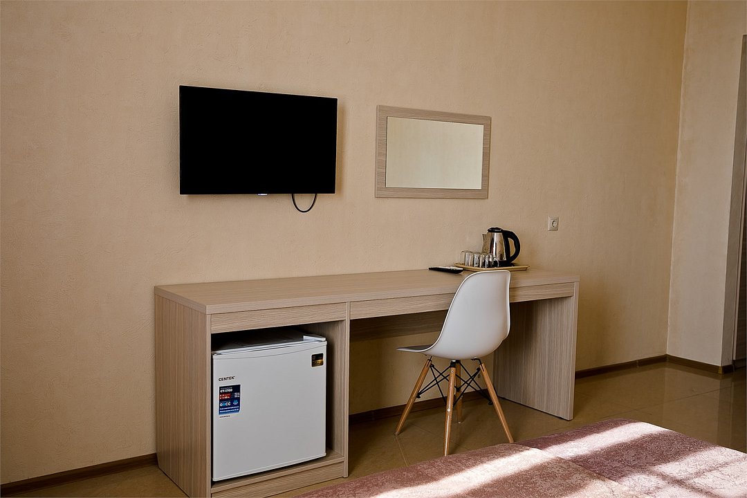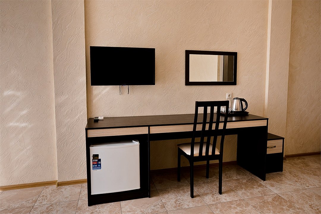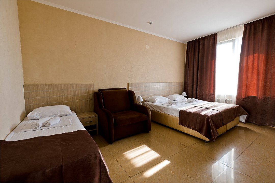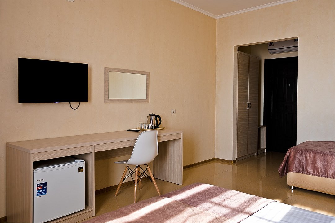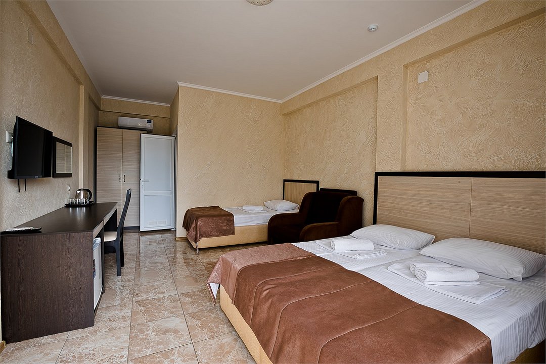 Wi-Fi, кондиционер, светильник, фен, ортопедический матрас, тумбы, шкаф для одежды, вешалки, чайник, унитаз, раковина, отопление, душ, плиточное покрытие, три односпальные кровати, вид во двор, стаканы, стул, туалетные средства, сушилка для белья, телевизор с плоским экраном, мини-холодильник, москитная сетка, номер для некурящих, вид на бассейн, рабочий стол, кресло-кровать, услуги прачечной (платно), мыло, затемняющая штораВ гостиничном номере