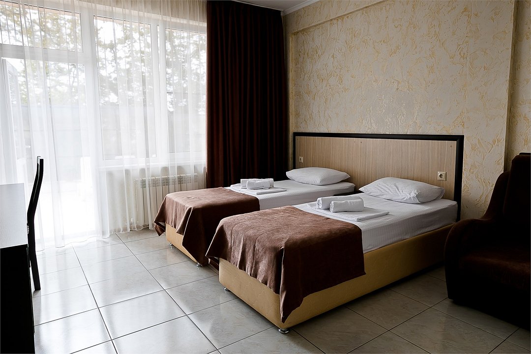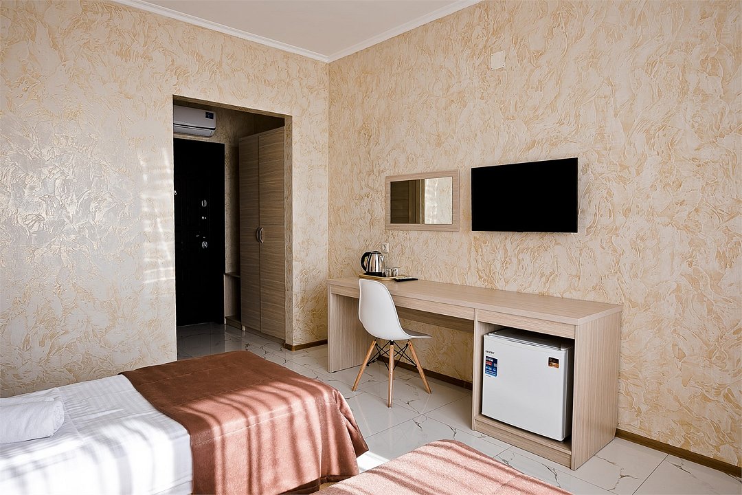 Wi-Fi, холодильник, кондиционер, светильник, фен, обогреватель, санузел, банные полотенца, две односпальные кровати, тумбы, шкаф для одежды, вешалки, зеркало, чайник, унитаз, раковина, отопление, отдельный вход в номер, душ, плиточное покрытие, вид во двор, стаканы, стул, стол, туалетные средства, сушилка для белья, телевизор с плоским экраном, мини-холодильник, москитная сетка, номер для некурящих, холодильный шкаф, кресло-кровать, уборка номера, услуги прачечной (платно), мыло, затемняющая штора, прачечная (за дополнительную плату)В гостиничном номере