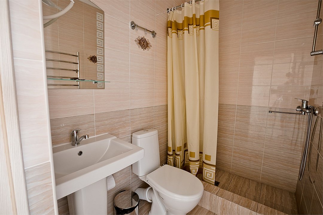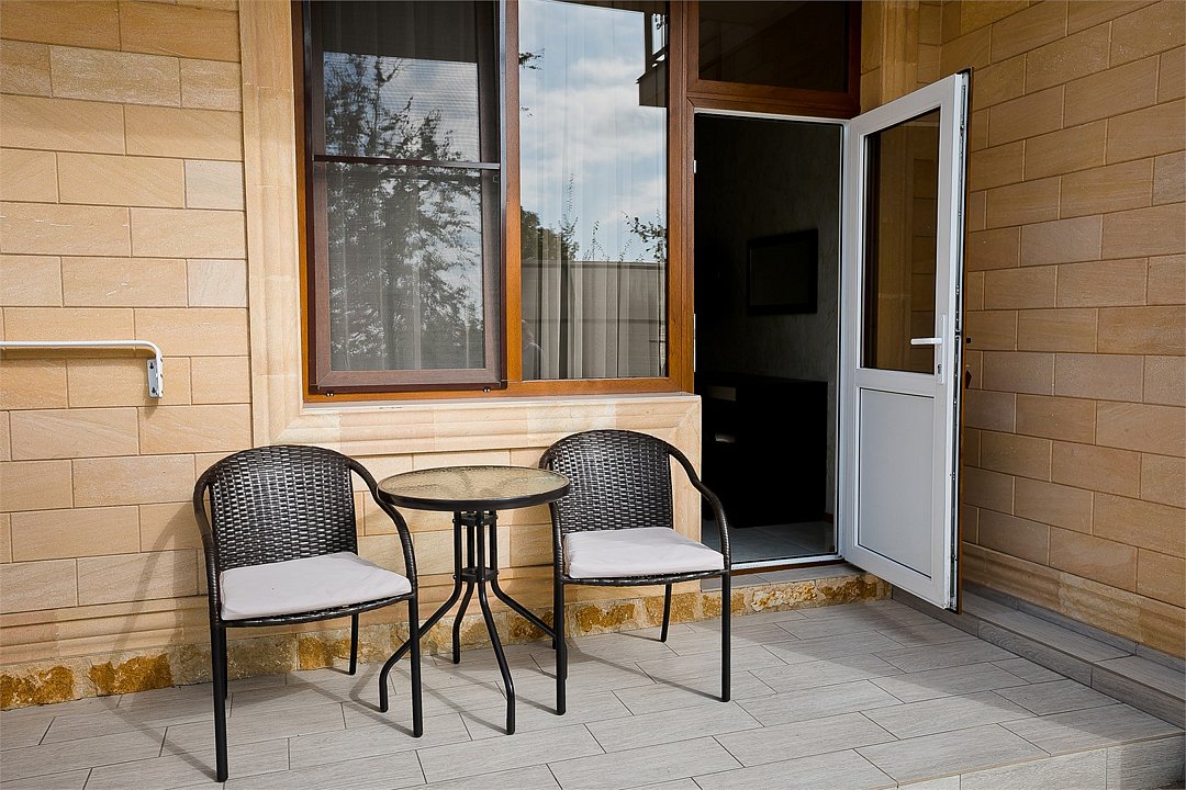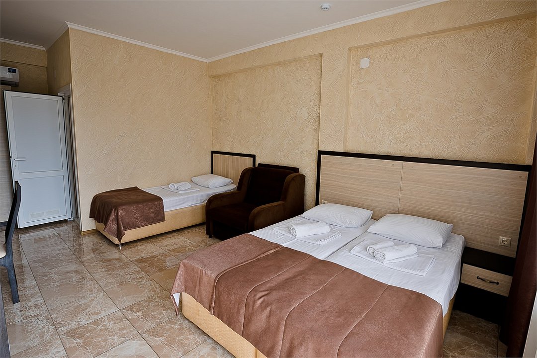 Wi-Fi, кондиционер, светильник, фен, банные полотенца, балкон, ортопедический матрас, тумбы, шкаф для одежды, вешалки, чайник, унитаз, раковина, отопление, отдельный вход в номер, душ, вид на море, плиточное покрытие, три односпальные кровати, вид во двор, стул, стол, сушилка для белья, телевизор с плоским экраном, мини-холодильник, номер для некурящих, рабочий стол, кресло-кровать, уборка номера, услуги прачечной (платно), мыло, затемняющая штора, прачечная (за дополнительную плату)В гостиничном номере