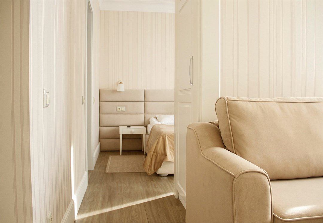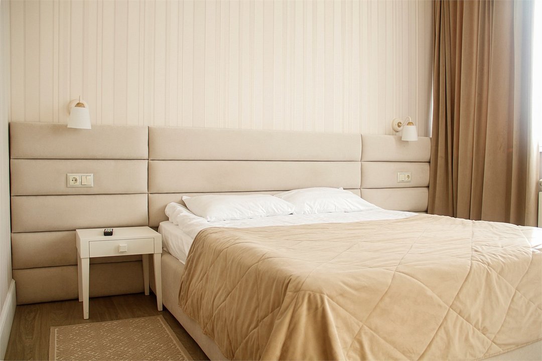 Двухместный двухкомнатный номер. Номера расположены в корпусе № 6 на 5 этаже с панорамным видом на море. Номер включает в себя просторную прихожую с гардеробной, жилую комнату, спальную комнату, зону кухни с кухонным гарнитуром и вытяжкой. В номере есть все, необходимое для отдыха и оздоровления. Если Вам нужна дополнительная уборка, дополнительная смена постельного белья, туалетные принадлежности - обратитесь к сотрудникам отдела приема и размещения - услуга платная. Номер оснащен халатами и тапочками. Для самых маленьких гостей предоставляются бесплатно: детские кроватки (1250*650), услуга под запрос.Услуги и удобства