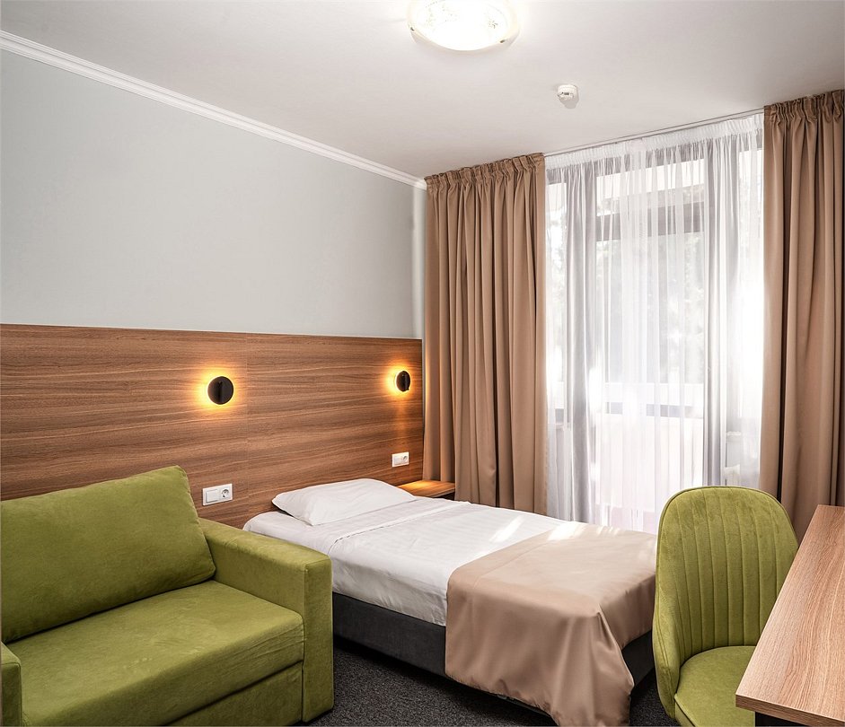 Одноместный однокомнатный номер (относится к 1-ой категории). Номера расположены в корпусах № 2, 6. В номере есть все, необходимое для отдыха и оздоровления. Если Вам нужна дополнительная уборка, дополнительная смена постельного белья, туалетные принадлежности, одноразовые тапочки - обратитесь к сотрудникам отдела приема и размещения - услуга платная. Для самых маленьких гостей предоставляются бесплатно: детские кроватки (1250*650), услуга под запрос. Обратите внимание! Есть номера без возможности дополнительного места. Этаж и номер корпуса присваиваются при заселении, исходя из наличия свободных чистых номеров. При этом мы максимально учтем Ваши пожелания, чтобы сделать Ваш отдых комфортным.Услуги и удобства