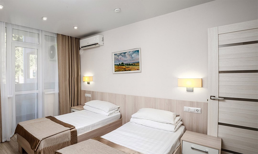 Двухместный однокомнатный номер (относится к 1-ой категории). Номера расположены в корпусах № 2, 4. В номере есть все, необходимое для отдыха и оздоровления. Если Вам нужна дополнительная уборка, дополнительная смена постельного белья, туалетные принадлежности, одноразовые тапочки - обратитесь к сотрудникам службы приема и размещения - услуга платная. Для самых маленьких гостей предоставляются бесплатно: детские кроватки (1250*650), услуга под запрос. Обратите внимание! Есть номера без возможности дополнительного места. Этаж и номер корпуса присваиваются при заселении, исходя из наличия свободных чистых номеров. При этом мы максимально учтем Ваши пожелания, чтобы сделать Ваш отдых комфортным.Услуги и удобства
