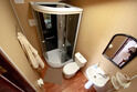 Ванная комната: душевая кабина, унитаз, раковина, зеркало, коврик, гигиенические