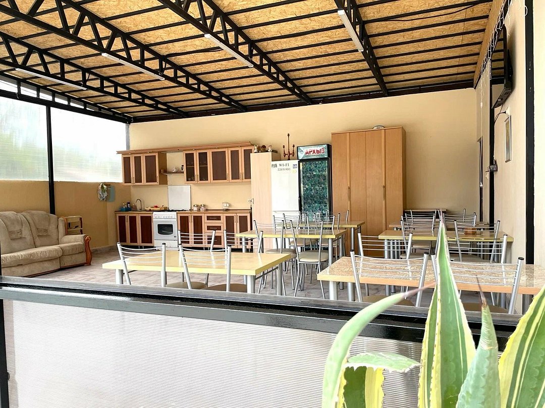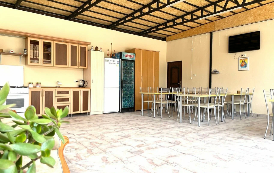 На общей кухне постояльцы найдут все необходимые столовые приборы и посуду, а также смогут воспользоваться мангалом для готовки.