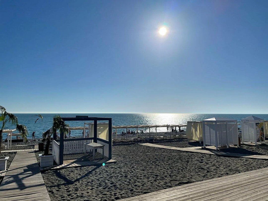 Ближайший галечный пляж, расположенный в 15 минутах пешком, полностью оборудован для комфортного отдыха приезжих.
