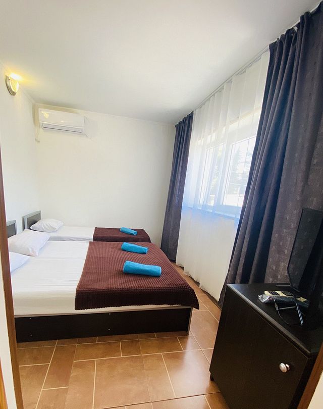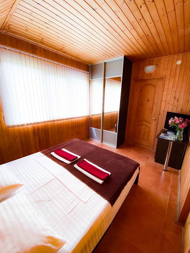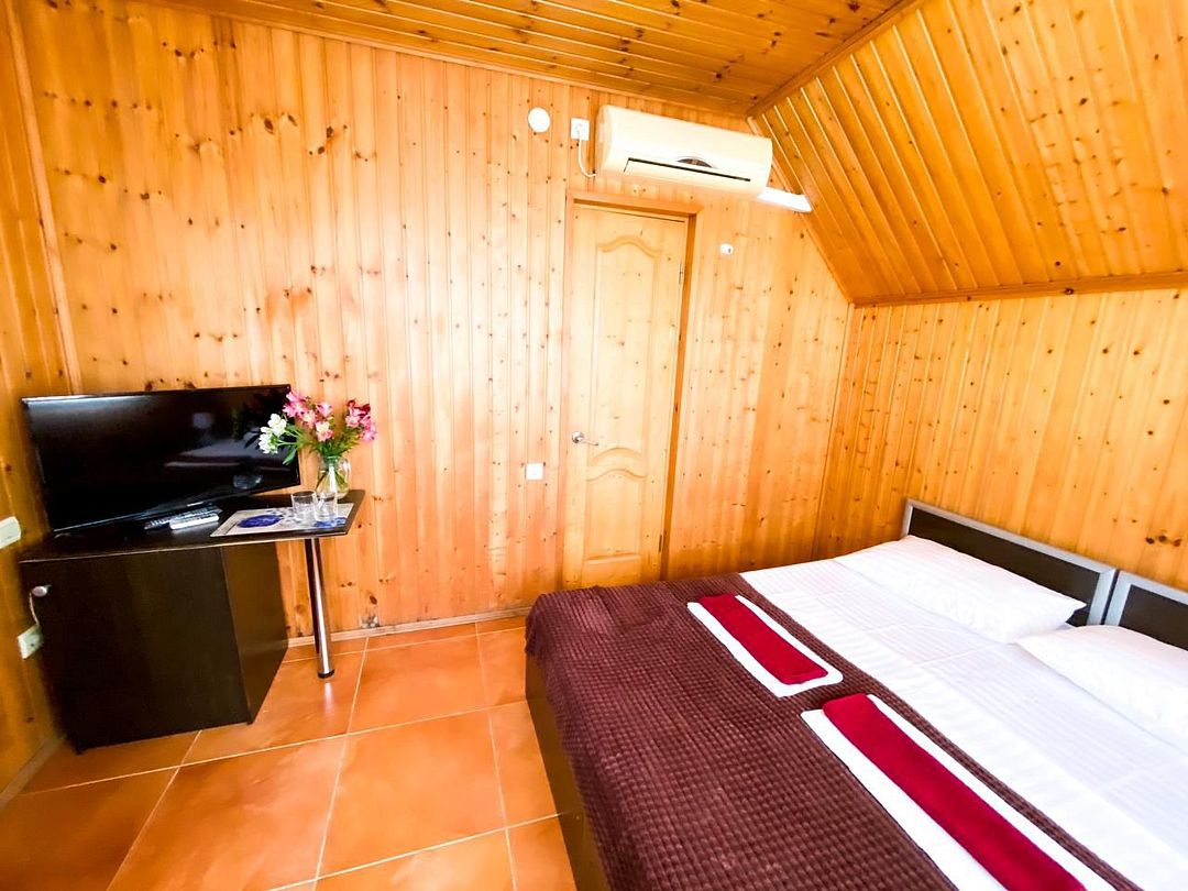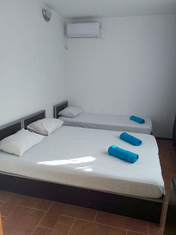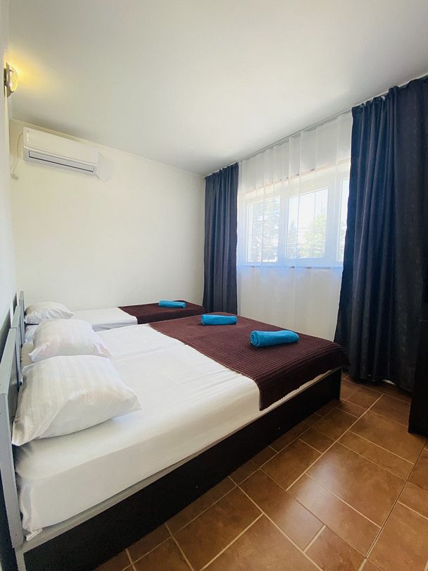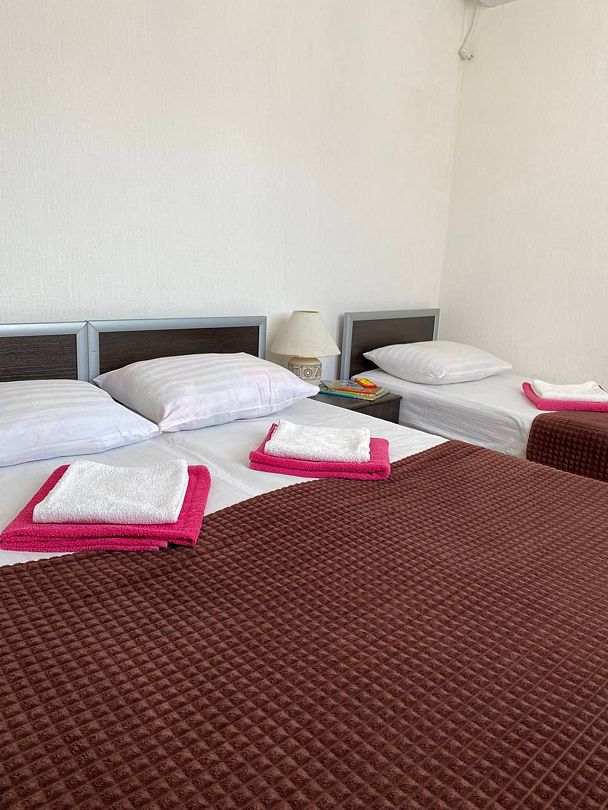 Четырехэтажный гостевой дом с мансардой разместился в 450 метрах от моря. Для размещения предлагаются номера разные по уровню комфорта и вместимости. В каждом номере есть кондиционер, телевизор, мини-холодильник, в бюджетных вариантах санузел располагается на этаже, другие же номера оснащены собственной ванной комнатой.
