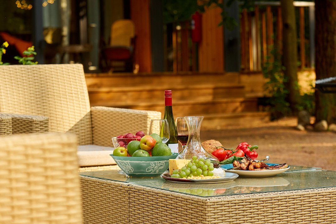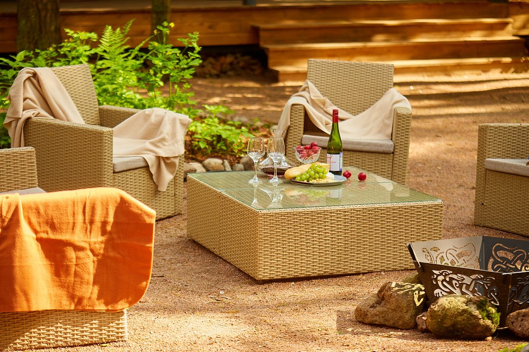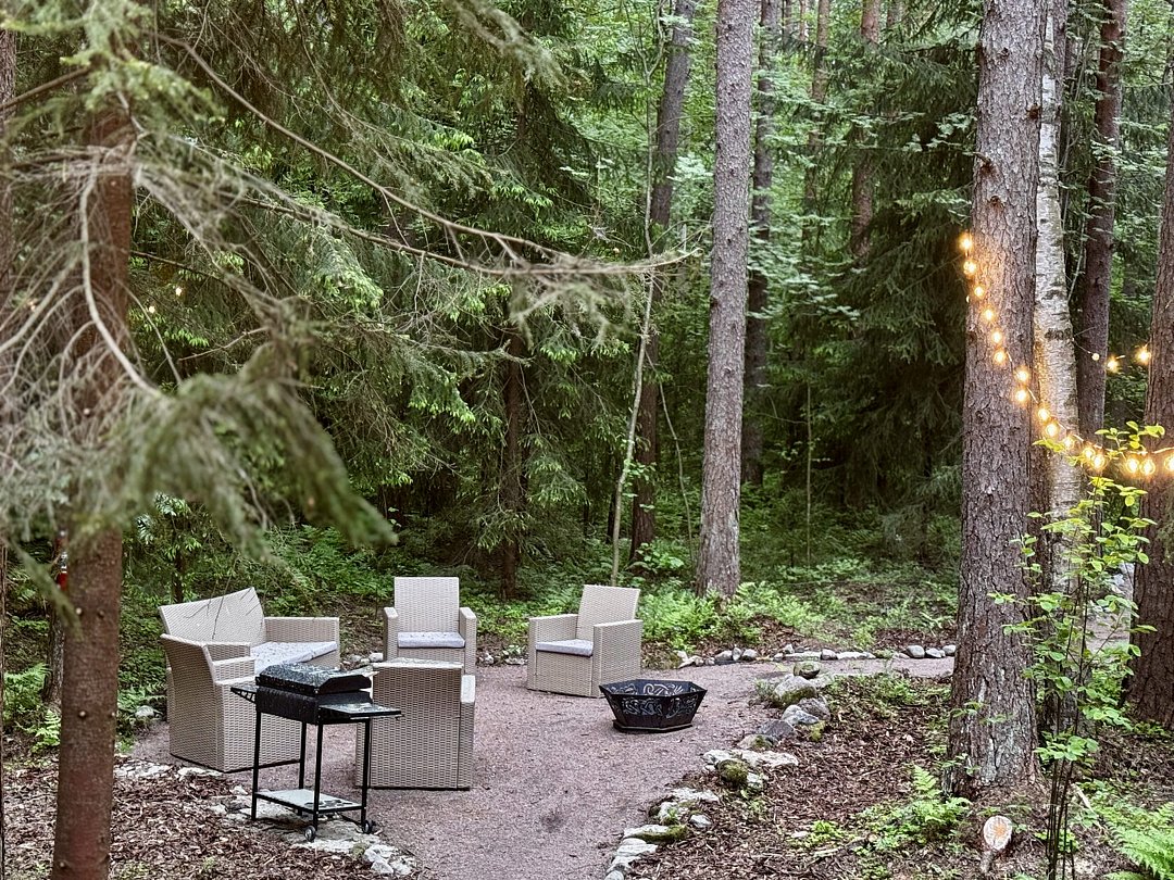 У дома большая терраса с обеденным столом и зоной для курения. На участке есть мангал, уличная мебель и костровая зона. Парковка для двух автомобилей.
