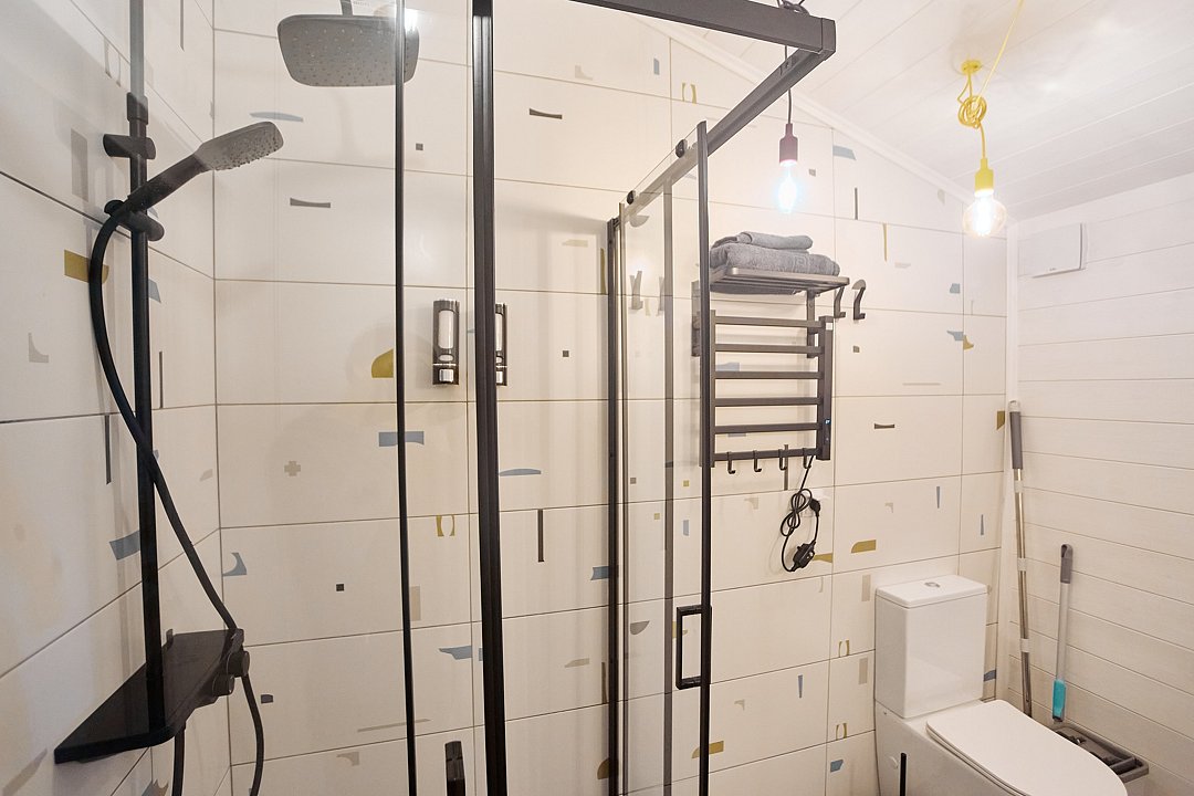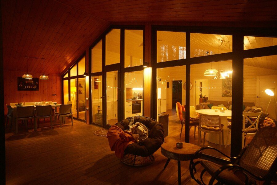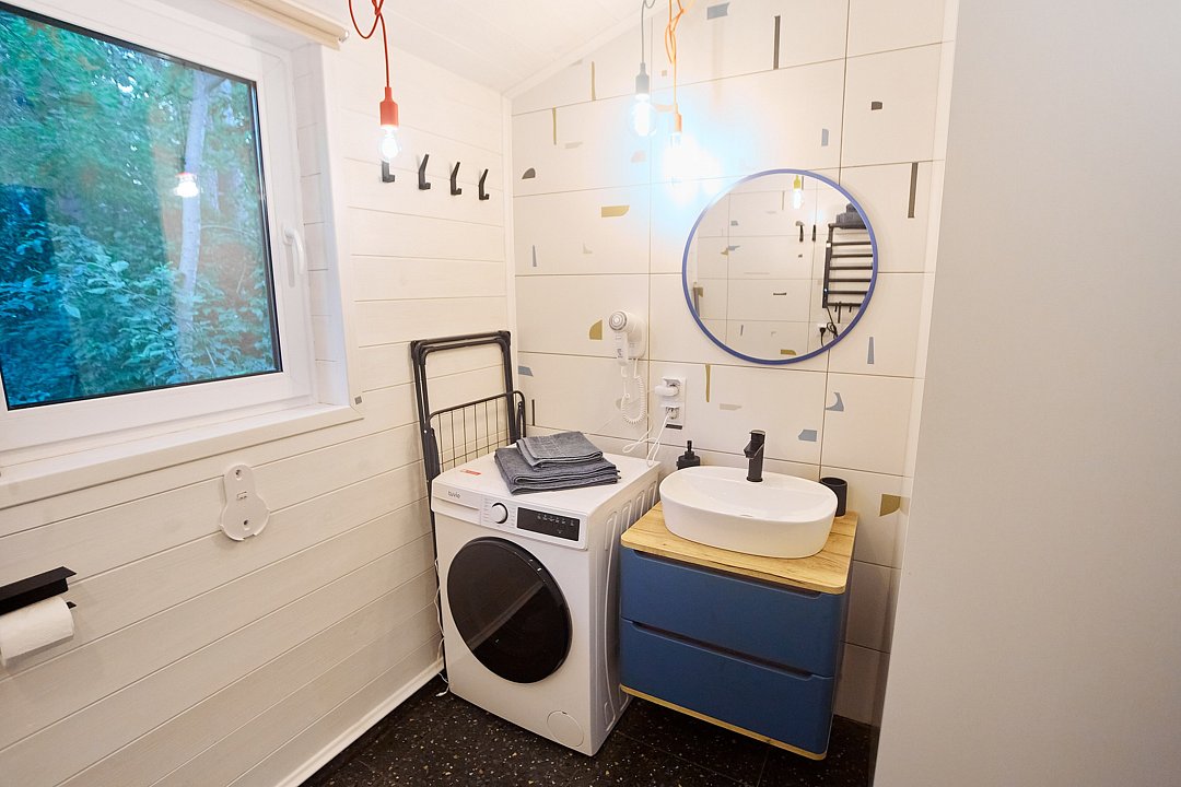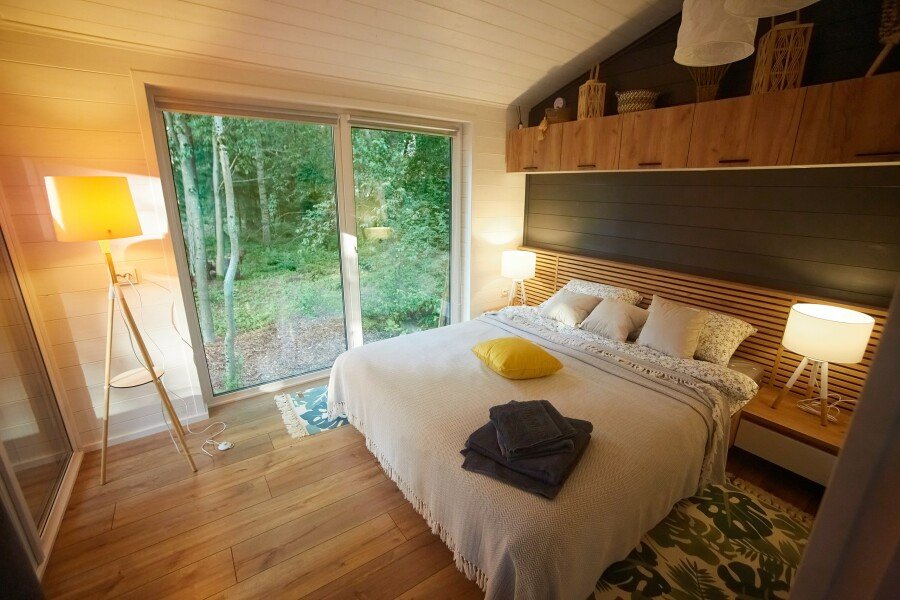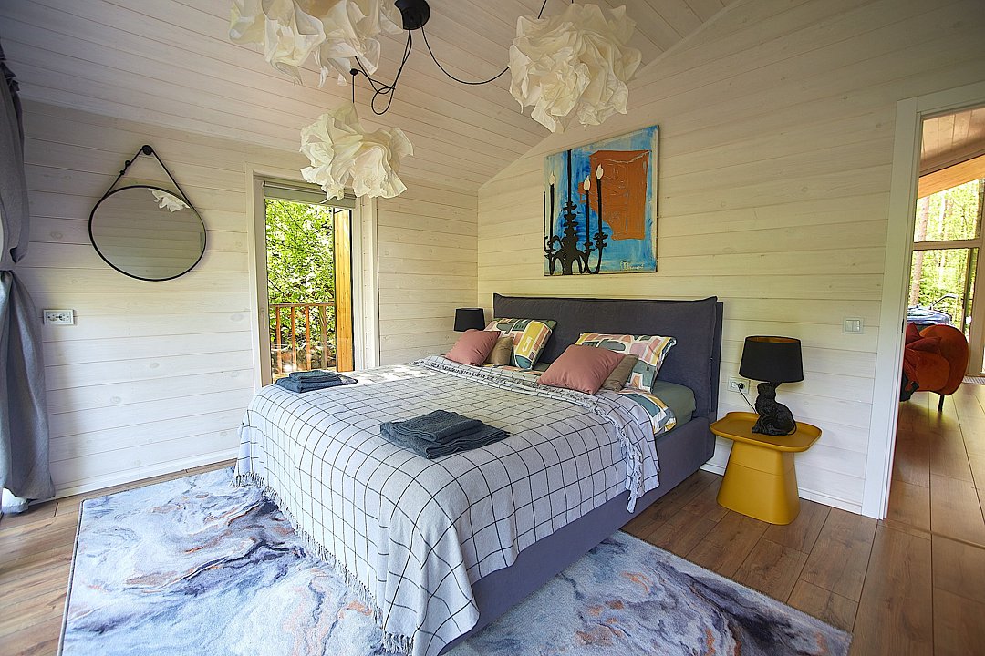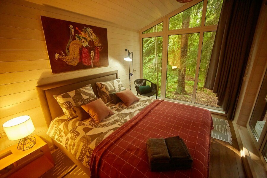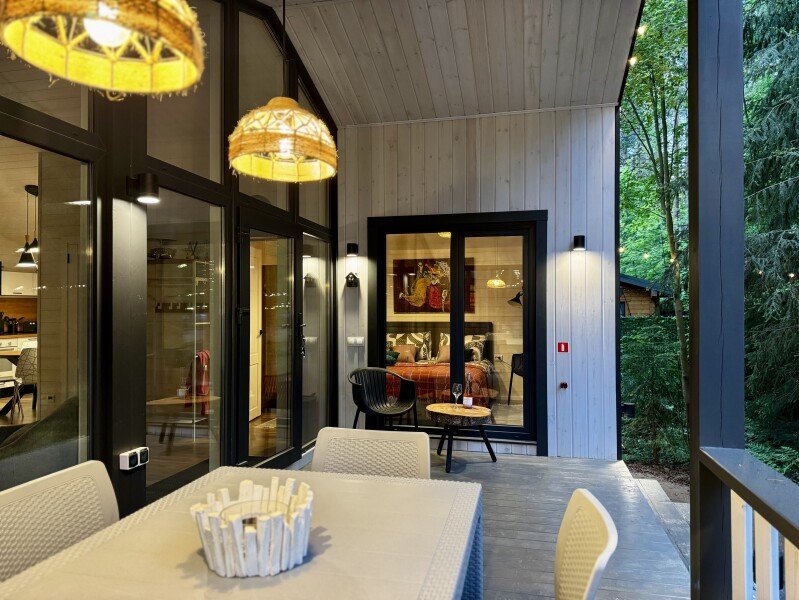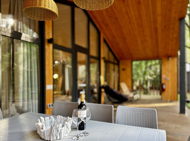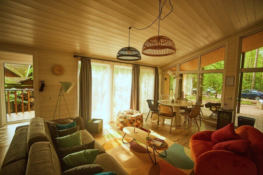 Свeтлые, уютные дома с большой террасой и панорамными окнами оборудованы всем необходимым для вашего комфортного отдыха. В каждом доме имеется кухня с винным баром, полностью оснащенная бытовой техникой и набором посуды, большая гостиная с bluеtооth колонкой и диваном, современная, просторная ванная с душевой и стиральной машиной, теплые полы во всех комнатах.