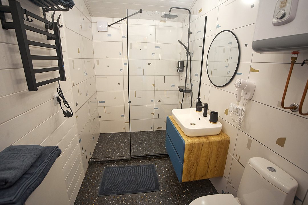 - просторная ванная с душевой, полотенцами, шампунем, мылом, феном и стиральной машиной;