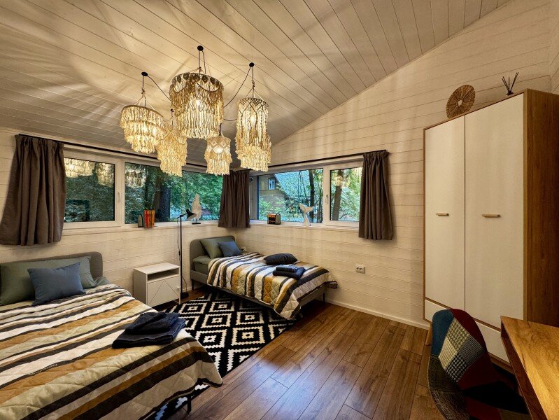 Дом легко вмещает компанию до 8 человек (есть 3 изолированные спальни и раскладной двуспальный диван в гостиной).