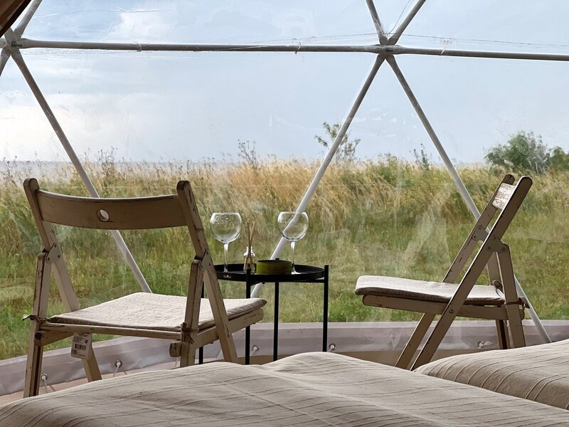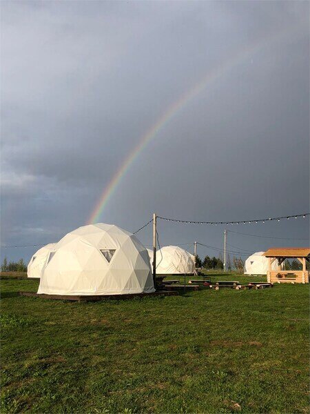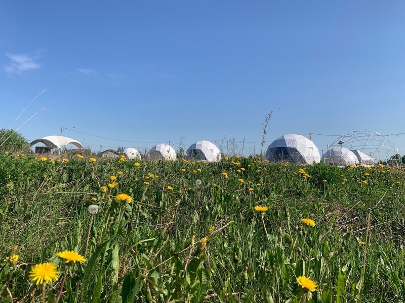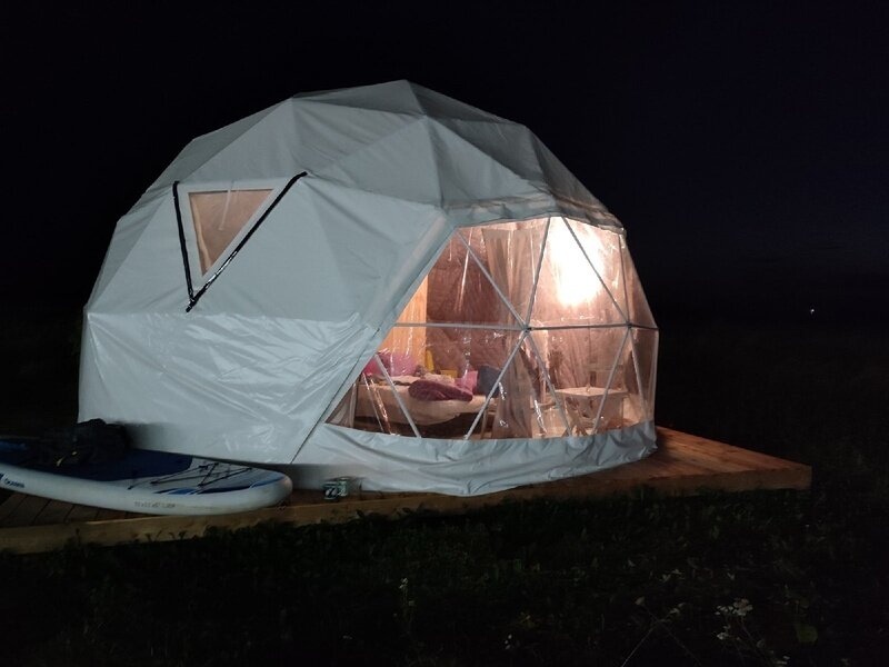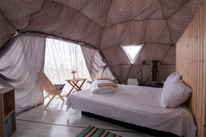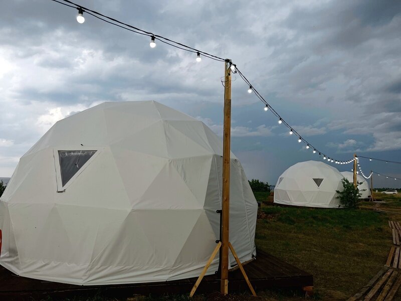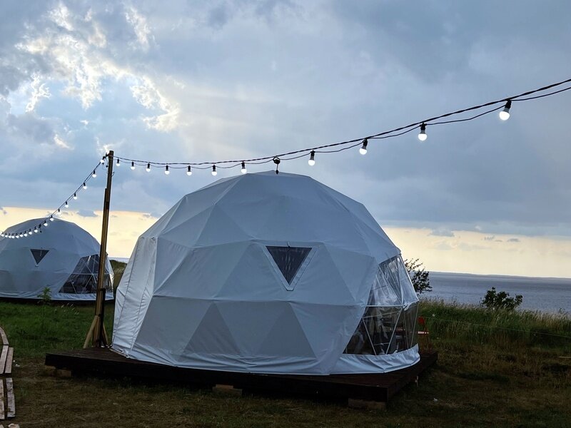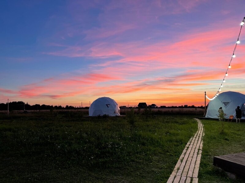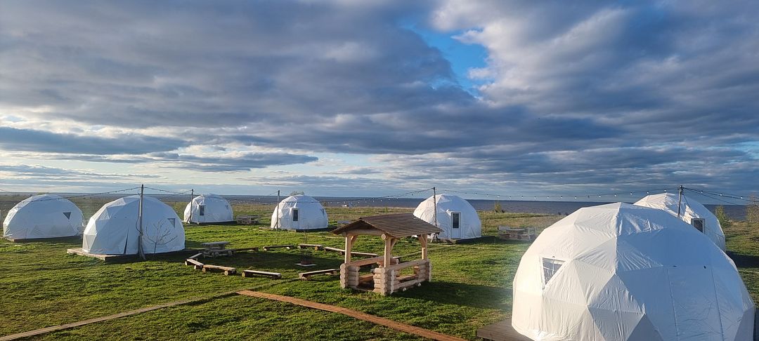 На территории глэмпинга — купольные шатры для проживания, панорамный вид на озеро и красоты природы никого не оставит равнодушным.