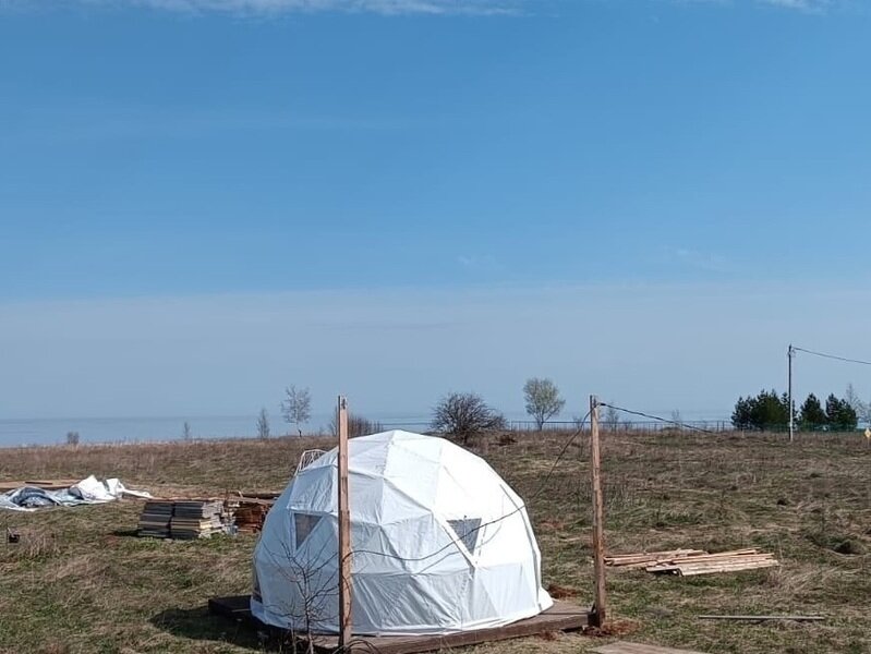Глэмпинг «Космосфера расположился на живописном высоком берегу Ильмень озера», с удобным спуском к воде.