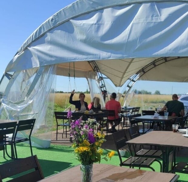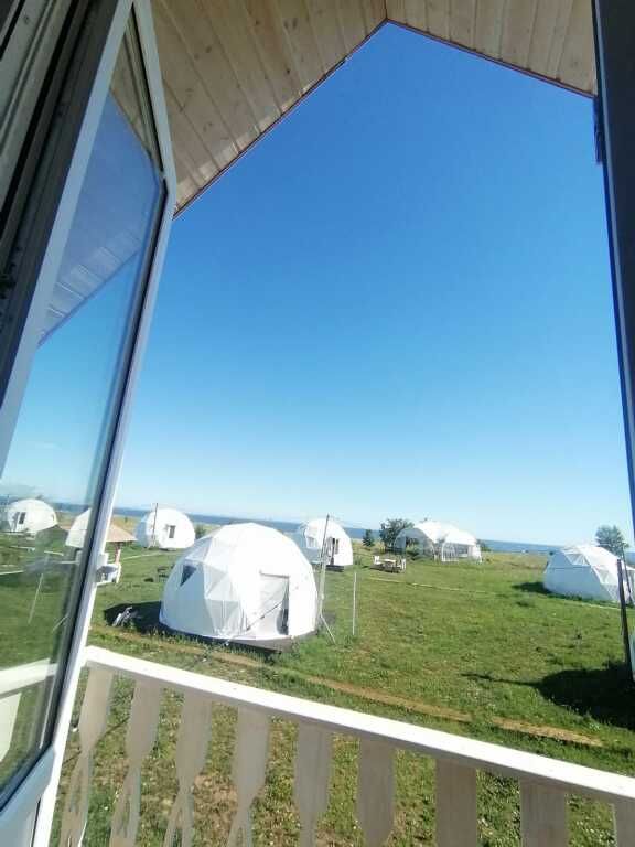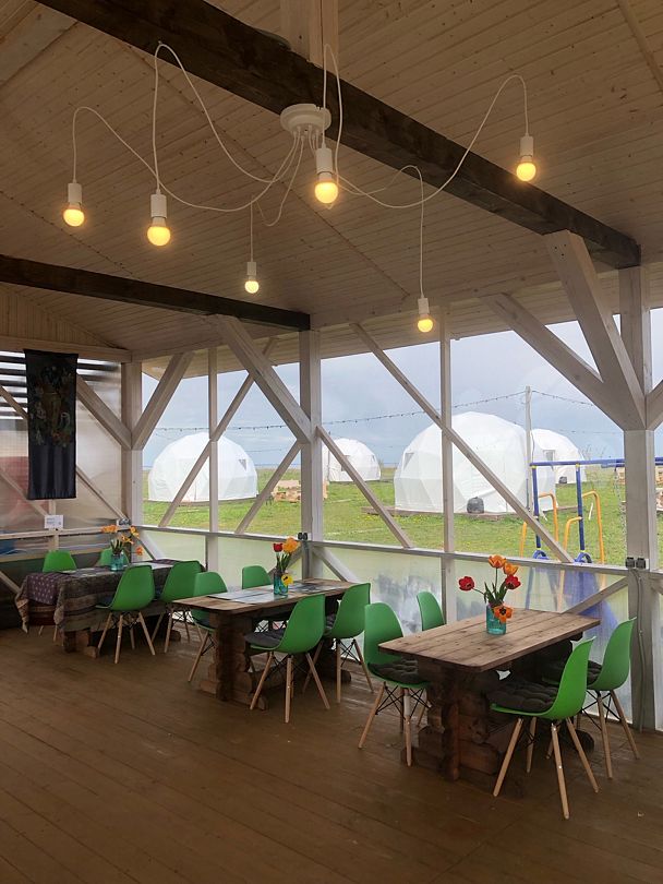 В центре глэмпинга расположен Арт-терраса, где по утрам подается завтрак. А в течении дня можно заказать прохладительные напитки и мороженое.