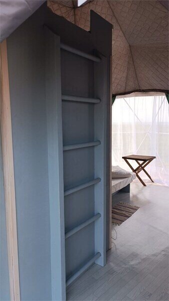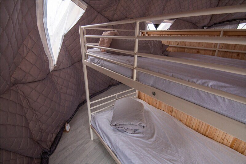 Купол оборудован кроватями с ортопедическими матрасами, трансформирующиеся из одной двуспальной в две односпальные и двухъярусной кроватью. Постельное белье и полотенца. Торшер, журнальный столик, стулья, напольная вешалка.