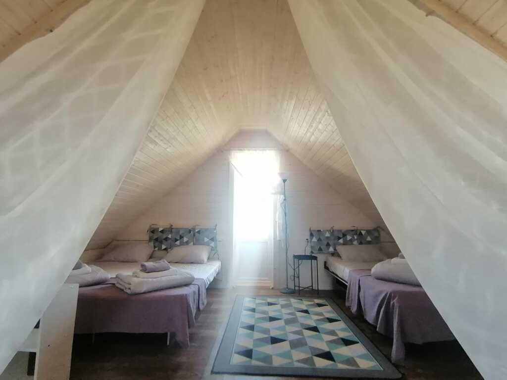 Купол оборудован кроватями, с ортопедическими матрасами, трансформирующиеся из одной двуспальной в две односпальные и спальным местом на мезонине на двоих (размер 160*200). Постельное белье и полотенца.